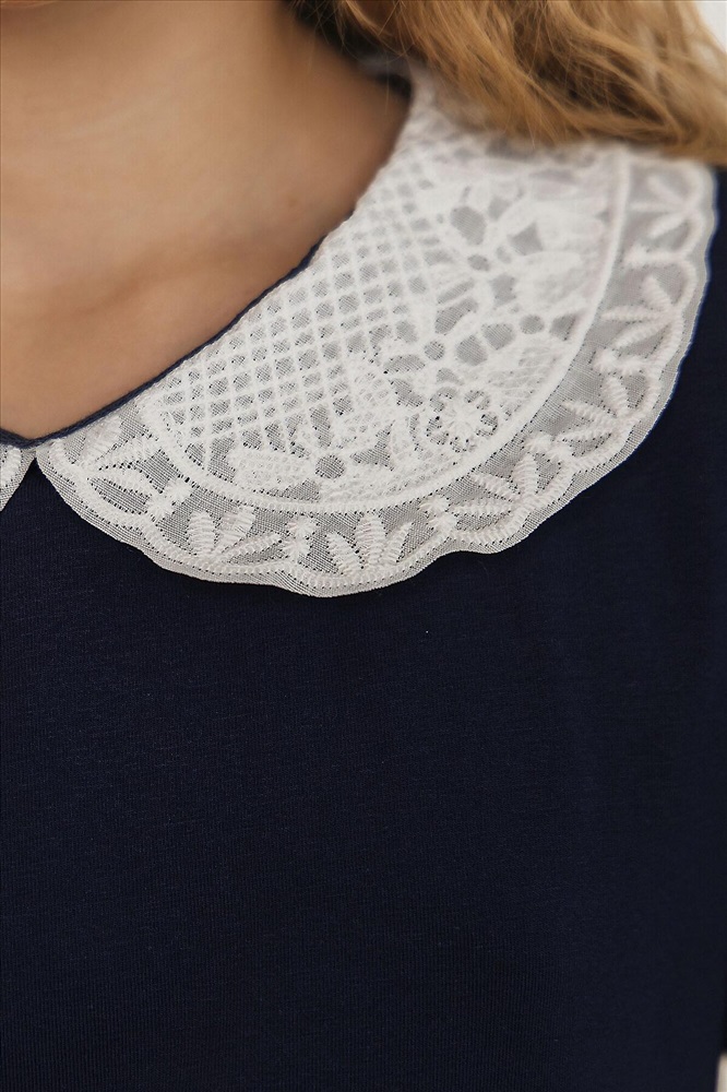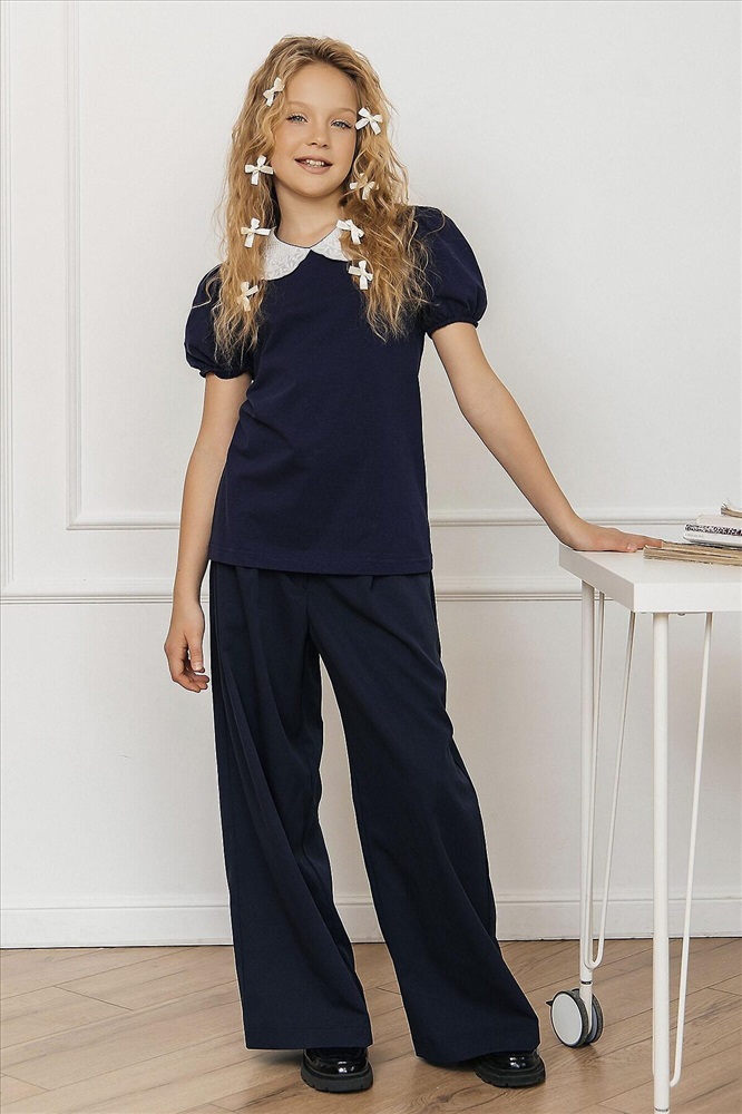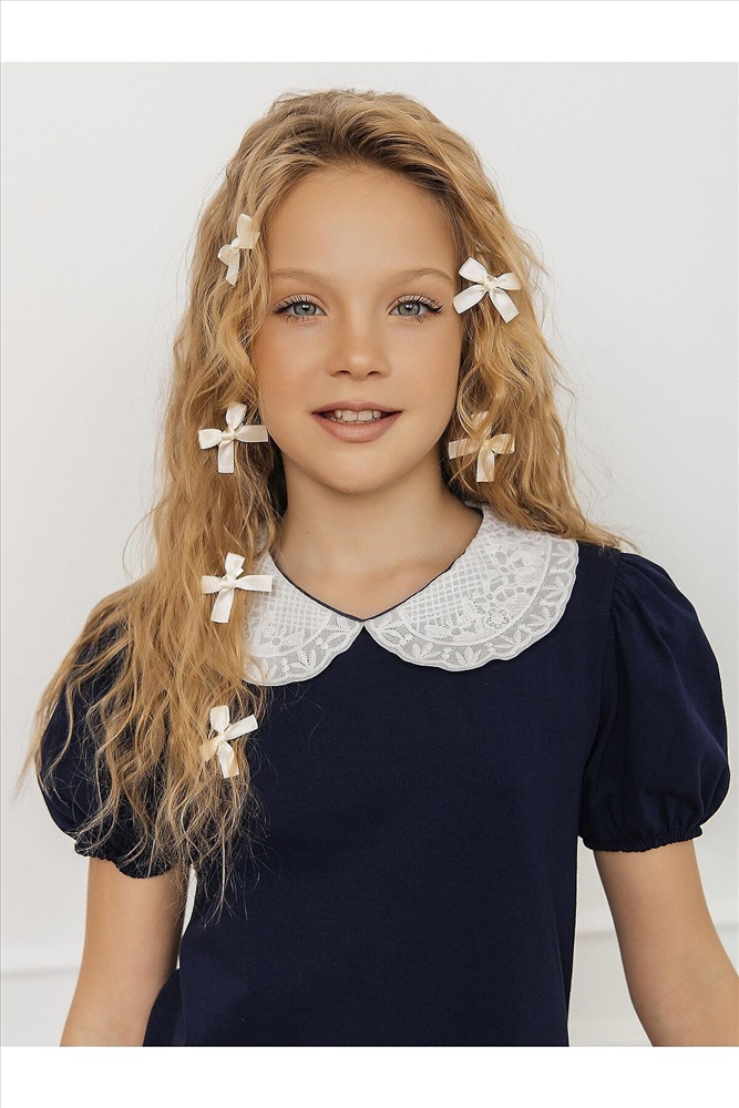 Страна производства: Россия Трикотажная блузка с коротким рукавом "фонарик" на резинке. Кружевной воротник. Застежка на спинке "щель"