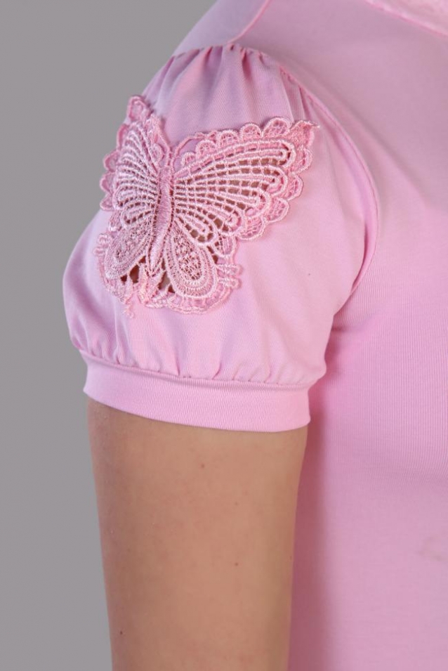 Яркая и нарядная блузка для девочки с короткими рукавами от бренда Jersey-Lab покорит сердце каждой маленькой модницы!Стильная детская рубашка с кружевом украшена нежными аппликациями с бабочками на рукавах. Это придает оригинальный стиль этой блузке. Нежные рукава-фонарики и кружевной воротник-стойка создают легкий и воздушный образ. Водолазка идеальна как повседневная школьная форма для детей.