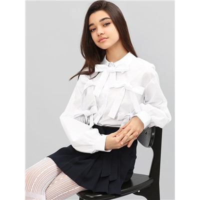 Блузка для девочки Соль&Перец, на пуговицах, из натурального хлопка. Особенностью блузки являются пышные рукава фонарики и пришитые ленты из основной ткани, которые добавляют ей изящества и уникальности. Блузка прекрасно сочетается с брюками или с юбкой, подчеркнёт индивидуальный стиль девочки, и разнообразит ее повседневный школьный образ.