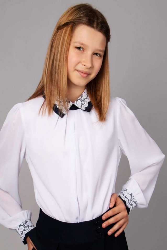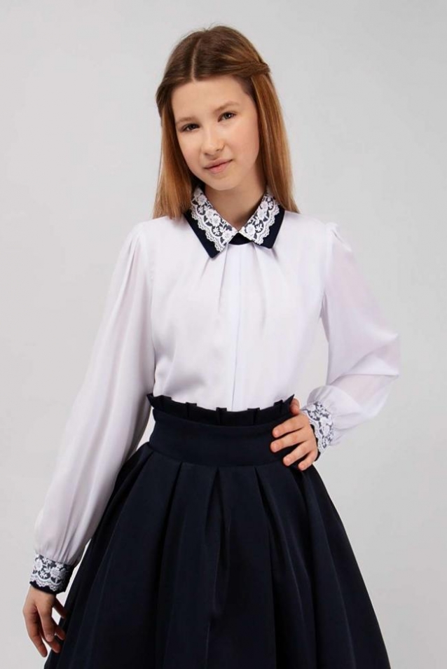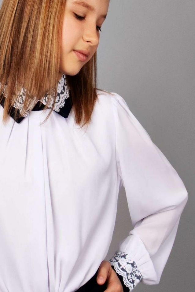 Элегантная блузка свободного силуэта для девочки. Отложной воротник и манжеты на рукавах оформлены кружевным декором. На спине застежка - молния, передняя часть блузки с подкладом. Прекрасный выбор для создания красивого школьного образа. Размер 128-34 (рост 122-128 см) длина изделия 49 см, полуобхват груди 37 см, длина рукава 44 см. Размер 134-36 (рост 128-134 см) длина изделия 51 см, полуобхват груди 38 см, длина рукава 48 см. Размер 140-38 (рост 134-140 см) длина изделия 53 см, полуобхват груди 40 см, длина рукава 51 см. Размер 146-40 (рост 140-146 см) длина изделия 55 см, полуобхват груди 43 см, длина рукава 55 см. Размер 152-42 (рост 146-152 см) длина изделия 57 см, полуобхват груди 46 см, длина рукава 57 см.