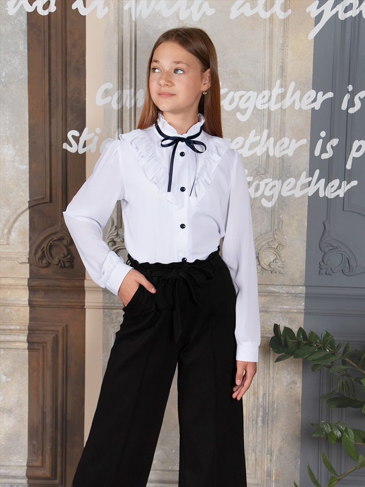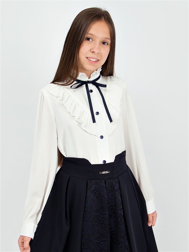 Блузка на пуговицах, с изящными воланами на груди. Ворот - стойка декорирован рюшей и тонкой репсовой лентой. Объемные рукава заканчиваются узкой манжетой на пуговице. Ткань - шифон. Прекрасный выбор для создания изысканного школьного образа.