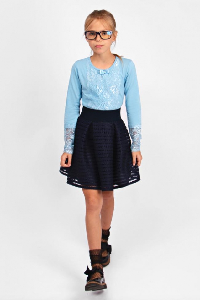 Передняя часть и рукава декорированы эластичным кружевом. Мягкий, приятный к телу трикотаж обеспечит идеальную посадку изделия по фигуре. Модель прекрасно подчеркнет индивидуальный стиль девочки, и разнообразит ее повседневный школьный образ.