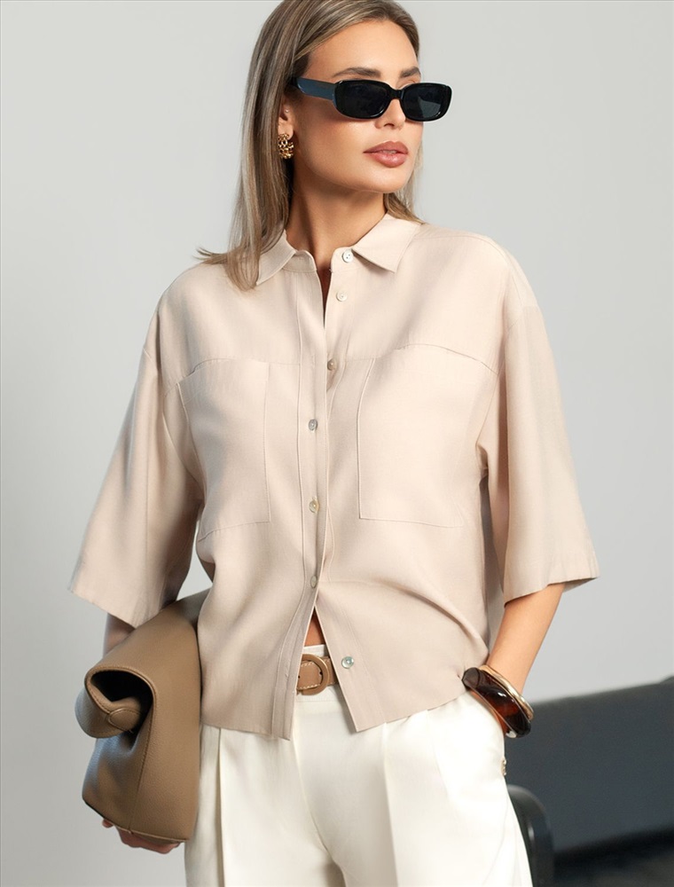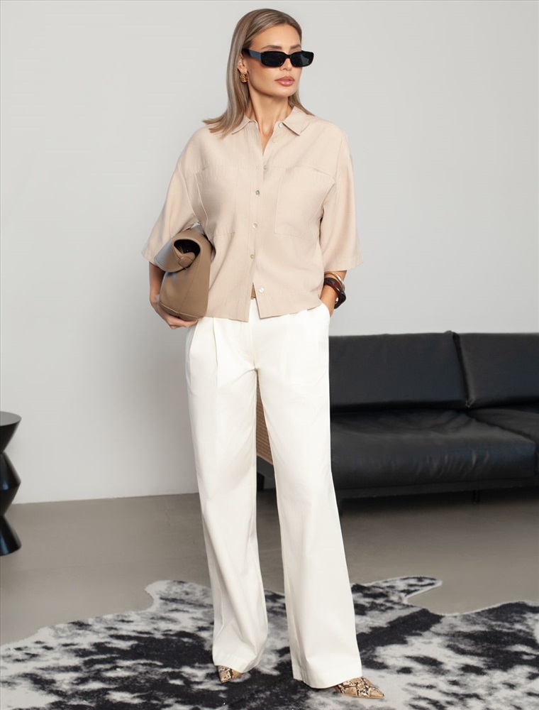 Состав: 70%Лиоцелл (Вис) 30%ПЭ; Параметры модели на первом фото: Рост 172, бюст 88, талия 64, бедра 88 Блузка выполнена из плотного лиоцелла. Свободная модель с застежеой на пуговицы. Ткань изделия отлично держит форму и не просвечивает. В теплое время года приятно охлаждает кожу. Добавление синтетических волокон в составе изделия, предотвращает сминаемостьи поддерживает формоустойчивость. Жилет сочетается в костюме с брюками D24.261, D24.267, D24.265, юбкой D24.261, D26.196, шортами D27.002.