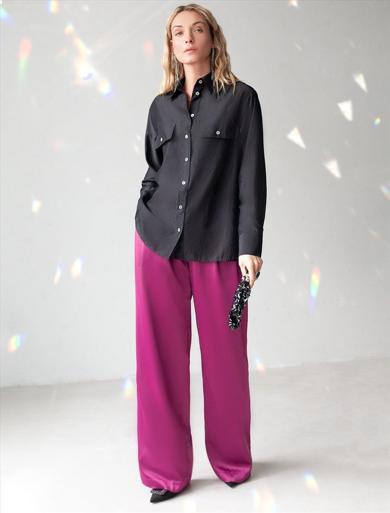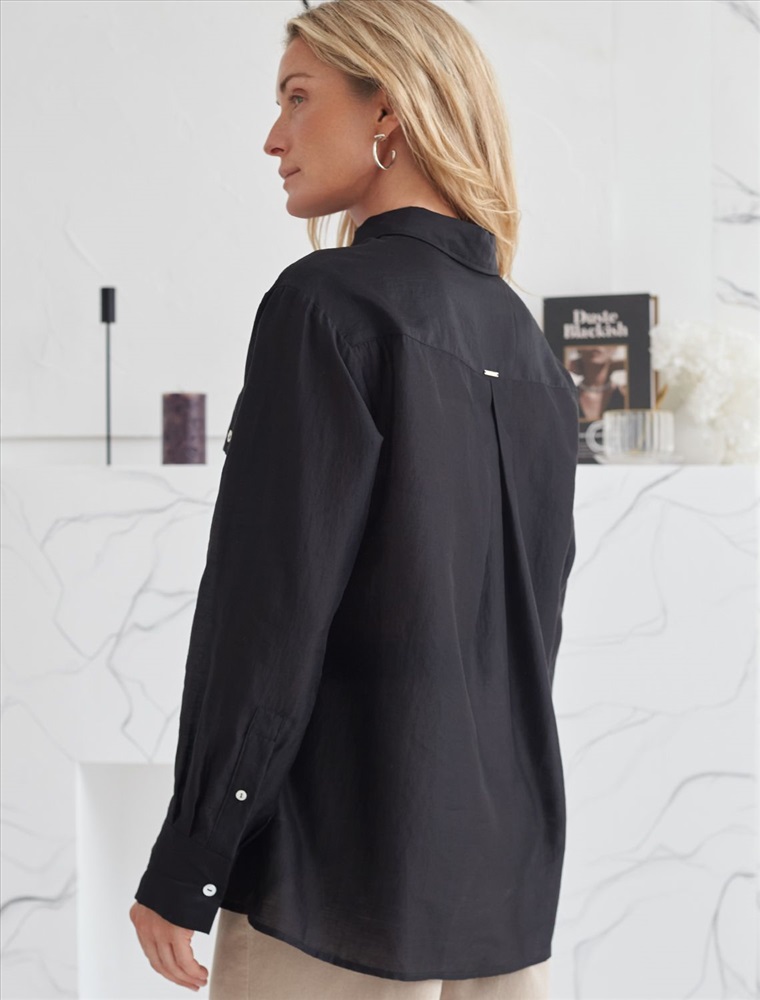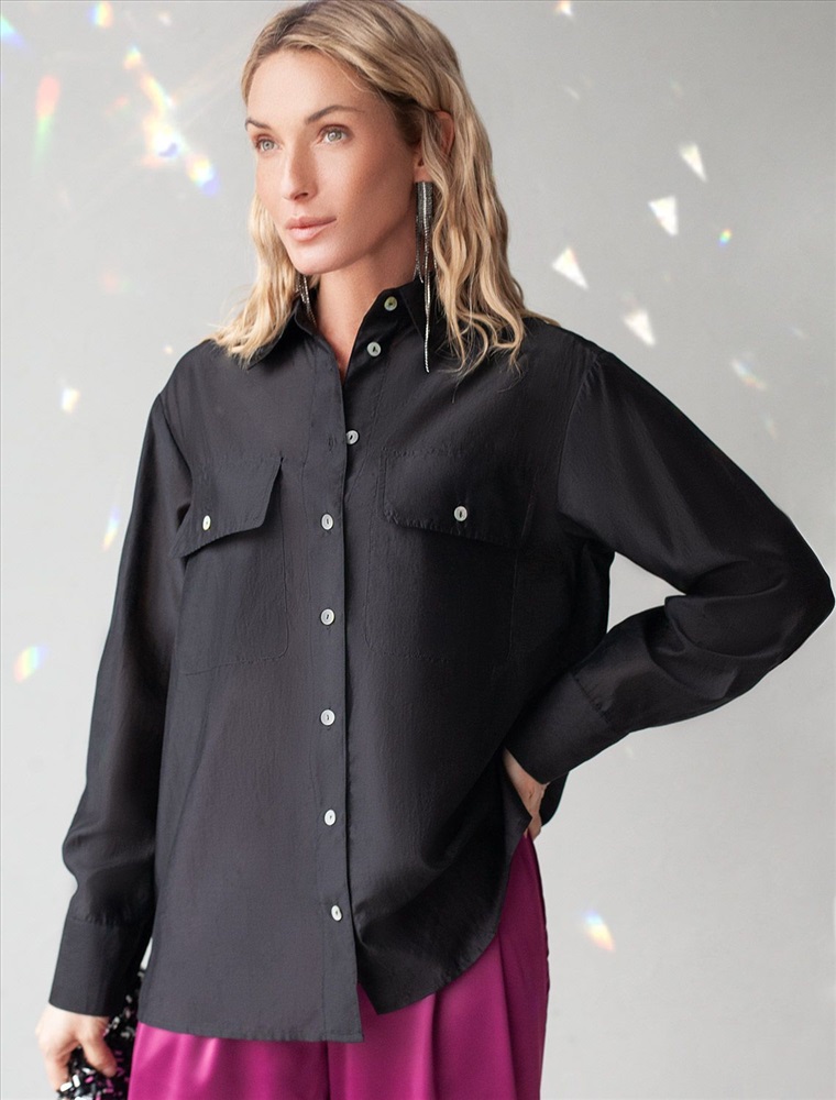 Блузка выполнена из полупрозрачного лиоцелла с эффектом шелка. Праздничная и переливающаяся фактура ткани изыскано играет в вечернем освещении. Легкая и почти невесомая модель, приятно ощущается на теле. Застежка на пуговицы из натурального перламутра, подчеркивает роскошь.