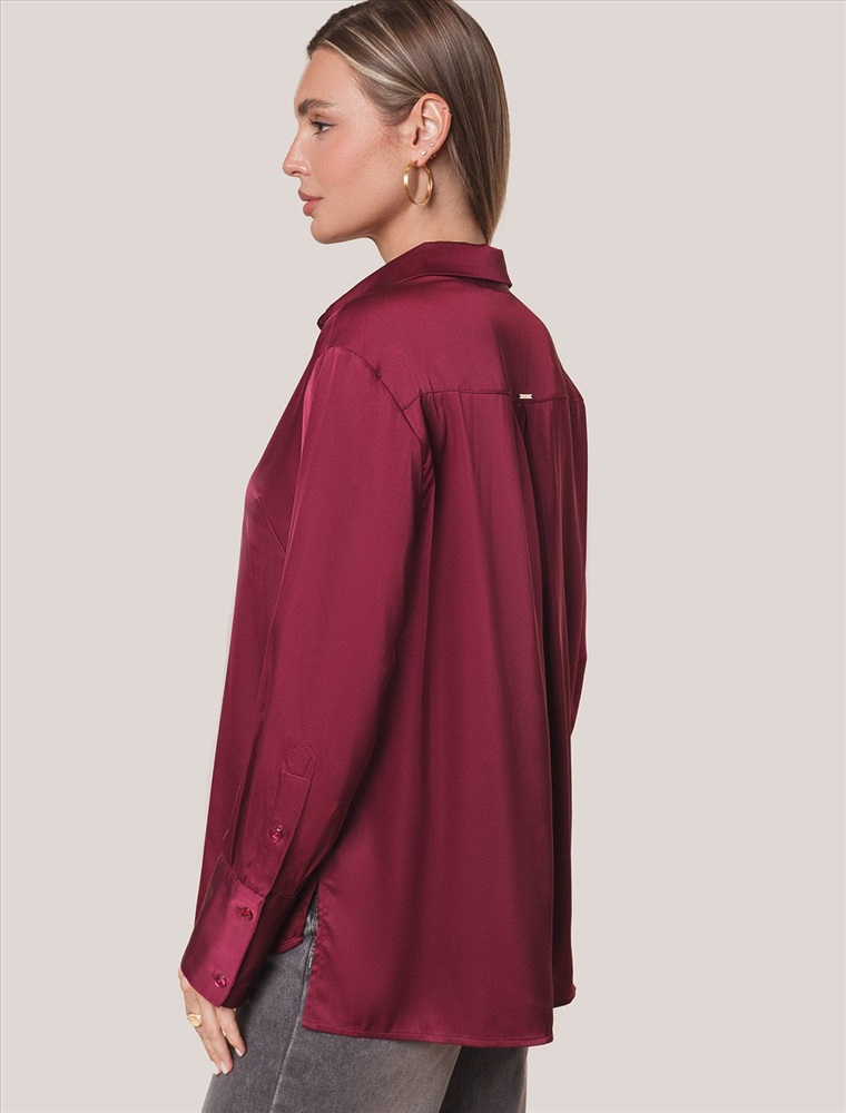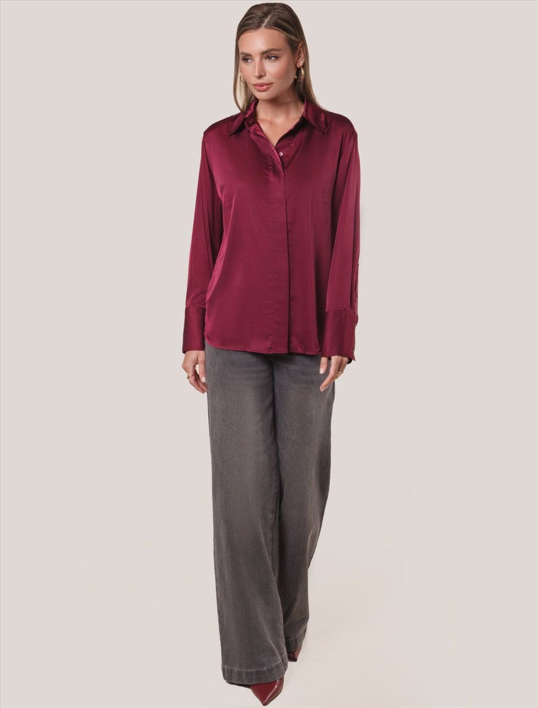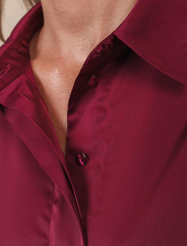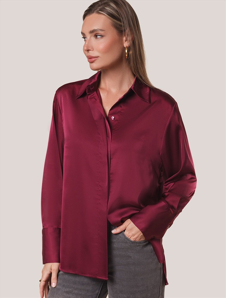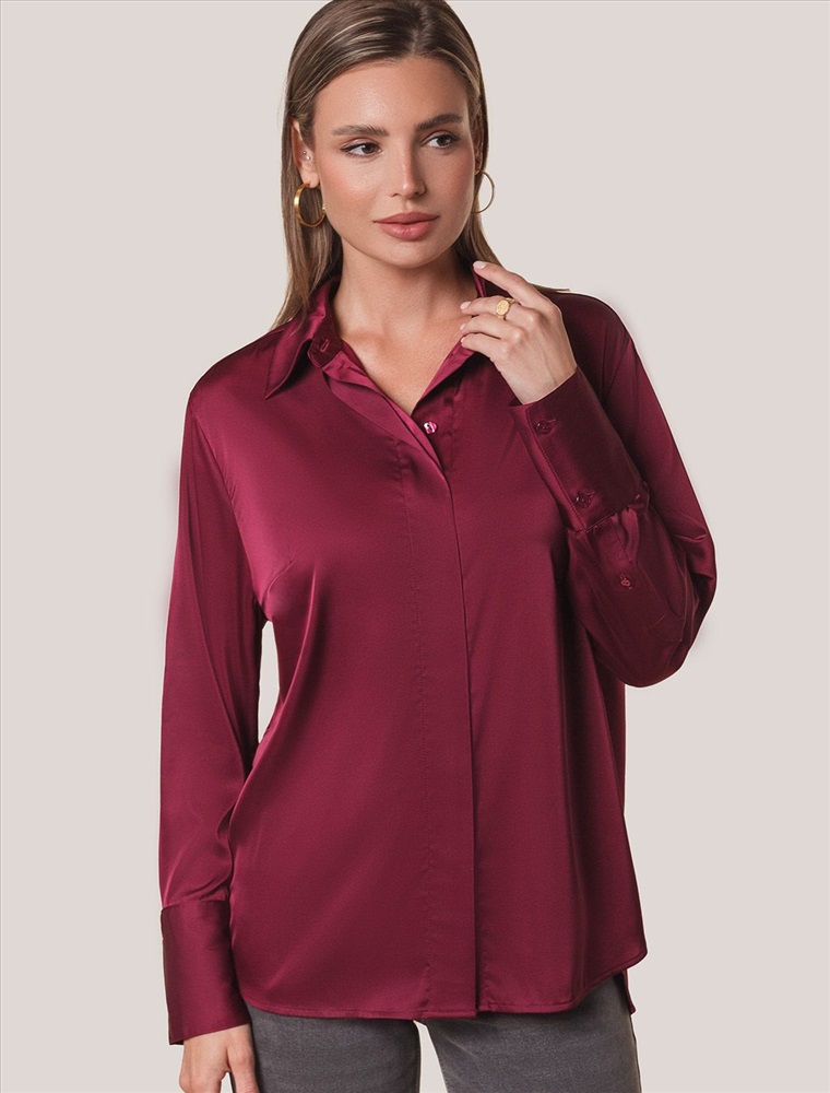 Сатиновая блузка с эластаном винного цвета – воплощение элегантности и комфорта. Благородный блеск сатина добавляет образу шика, а эластичность материала гарантирует удобство при носке. Прямой силуэт блузки обеспечивает комфорт, а эластичность материала предотвращает деформацию. Застежка-планка с потайными пуговицами придает модели аккуратность. Универсальный вариант для casual-образов.