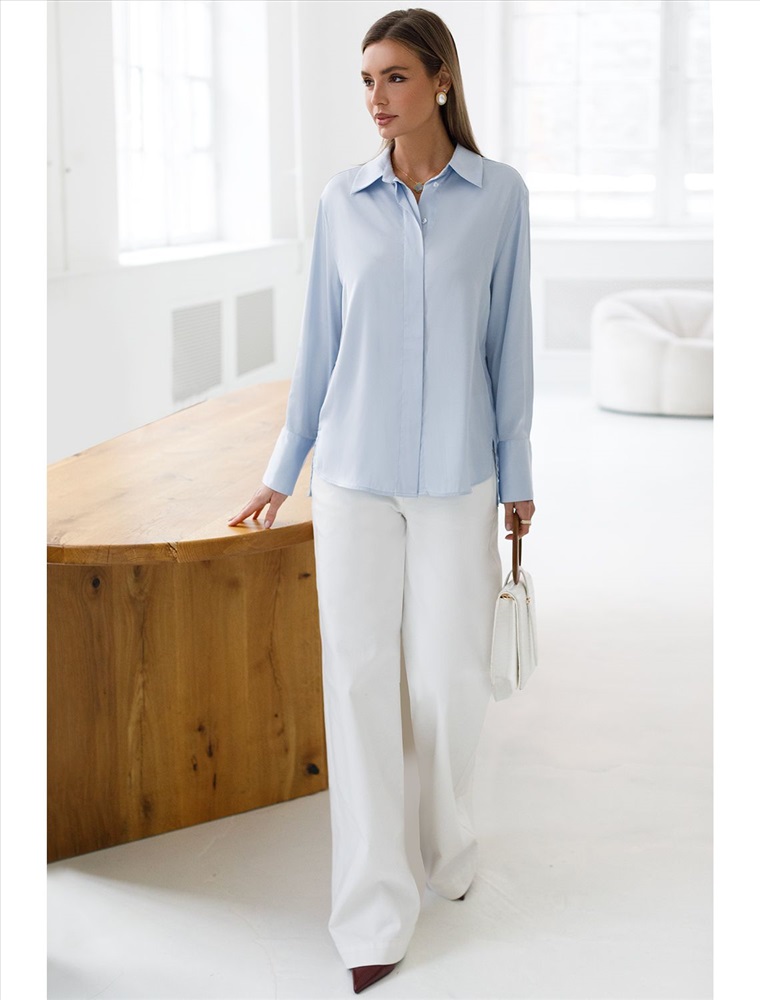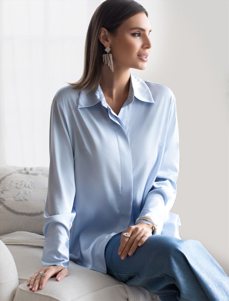 Состав: 94%ПЭ 6%ПУ; Плотность: 107 Г/м2; Параметры модели на первом фото: Рост 170, бюст 89, талия 63, бедра 92; Размер товара на первом фото: 42 Сатиновая блузка с эластаном в голубом цвете – воплощение элегантности и комфорта. Благородный блеск сатина добавляет образу шика, а эластичность материала гарантирует удобство при носке. Прямой силуэт блузки обеспечивает комфорт, а эластичность материала предотвращает деформацию. Застежка-планка с потайными пуговицами придает модели аккуратность. Универсальный вариант для casual-образов.