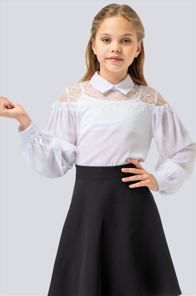 Выделяйся даже в рамках школьного дресс-кода! Детская блузка для девочек-подростков выполнена из струящегося шифона. Сочетание аккуратного кружева, объемных рукавов-фонариков с изящной сборкой и строгого отложного воротника делает образ невероятно нежным, воздушным и опрятным. Белая блузка для детей станет любимым элементом школьной формы и точно покорит сердца окружающих!