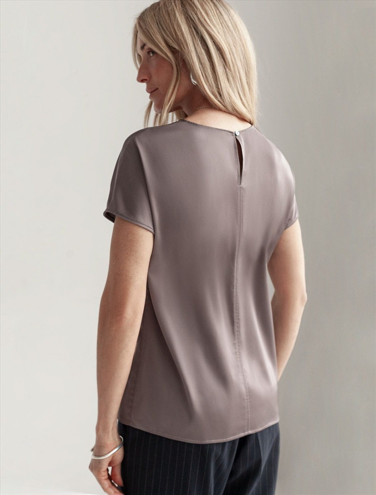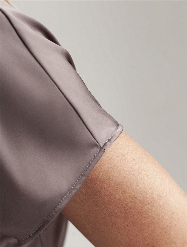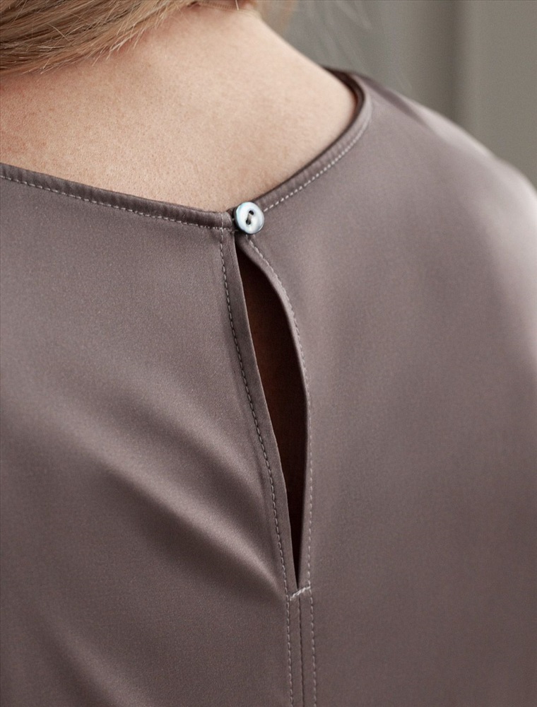 Стильная блузка кофейного цвета из сатина с удобной застежкой на пуговицу на спинке. Прямой крой и короткий рукав делают модель универсальной для любого сезона. Благородный блеск ткани подчеркивает элегантность, а удобная посадка обеспечивает комфорт. Благодаря эластану в составе ткань сохраняет первозданный вид, не образуя заломов. Ваш образ будет безупречен весь день! Блузка легко комбинируется с деловой одеждой и casual-вещами, подходит для разных случаев.