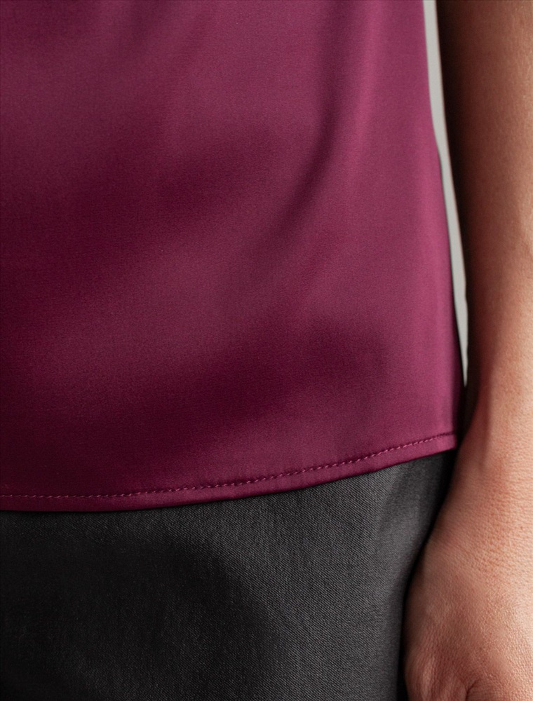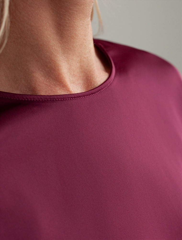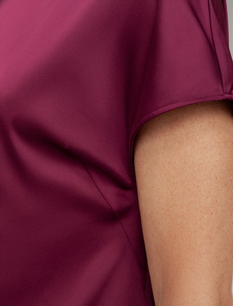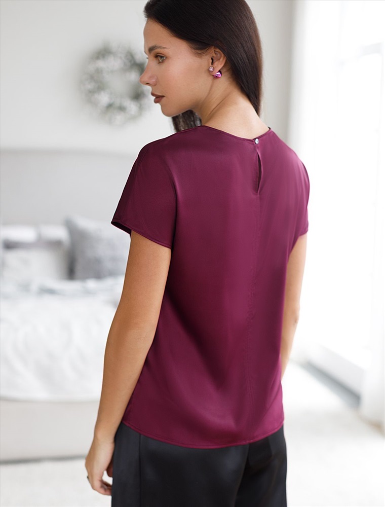 Стильная блузка винного цвета из сатина с удобной застежкой на пуговицу на спинке. Прямой крой и короткий рукав делают модель универсальной для любого сезона. Благородный блеск ткани подчеркивает элегантность, а удобная посадка обеспечивает комфорт. Благодаря эластану в составе ткань сохраняет первозданный вид, не образуя заломов. Ваш образ будет безупречен весь день! Блузка легко комбинируется с деловой одеждой и casual-вещами, подходит для разных случаев.