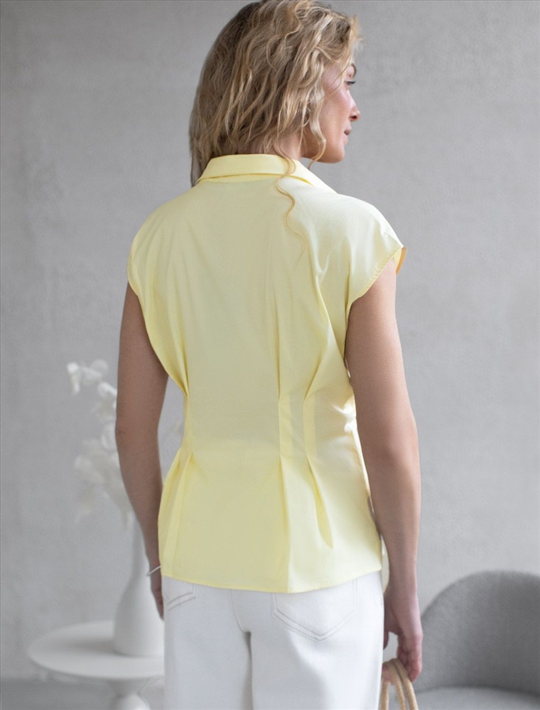 Изысканная женственная блузка лимонного цвета выполнена из легкого хлопкого поплина плотностью 96 Г/м2 и будет идеальна для создания комфортного и красивого образа в теплое время года. Натуральный материал отличается мягкостью и воздухопроницаемостью, что особенно ценно в жаркую погоду, а эластан в составе позволяет сохранить форму изделия. Основное преимущество повседневной блузки — аккуратный приталенный силуэт, подчеркивающий достоинства фигуры и создающий акцент на линии талии. Короткий цельнокроеный рукав придает образу свежесть и легкость. Однотонная рубашка с отложным воротничком подойдет для работы в офисе, встреч с друзьями, прогулок, для особого случая или праздника. Лаконичная легкая блузка отлично сочетается с разнообразными элементами гардероба, благодаря ей можно создать классический или романтичный образ.