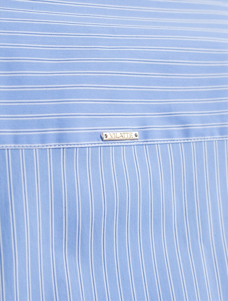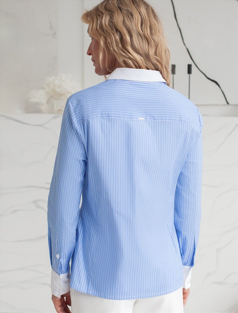 Стильная блузка голубого цвета в белую полоску приталенного силуэта подарит вам эффектный образ на весну и лето. Принт в полоску освежает внешний вид и стройнит фигуру и визуально вытягивает силуэт. Такой вид полосатой ткани называется пестротканой — полосы созданы переплетением нитей разных цветов. Смешанный состав ткани идеален для деловых блузок: хлопок приятен к телу, полиэстер повышает долговечность, ПУ (эластан) придает комфортную растяжимость. Идеально подходит для деловой работы и повседневной носки, подчеркивая вашу женственность и уверенность. Контрастные манжеты аккуратно оформлены и придают блузке дополнительный шарм, а воротник держит форму, добавляя образу элегантности. Блузка представлена так же в больших размерах, чтобы каждая могла подобрать вариант по своей фигуре. Эта красивая рубашка отлично сочетается с разными стилями и станет обязательной частью летнего гардероба. Простая, но стильная вещь, которая подчеркнет вашу индивидуальность и создаст эффектный образ.