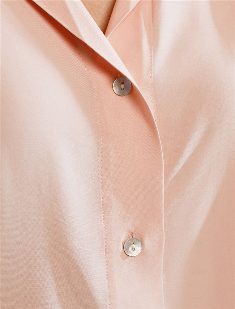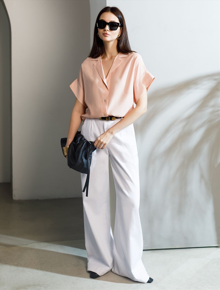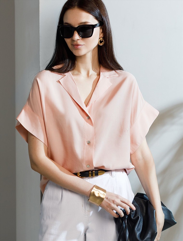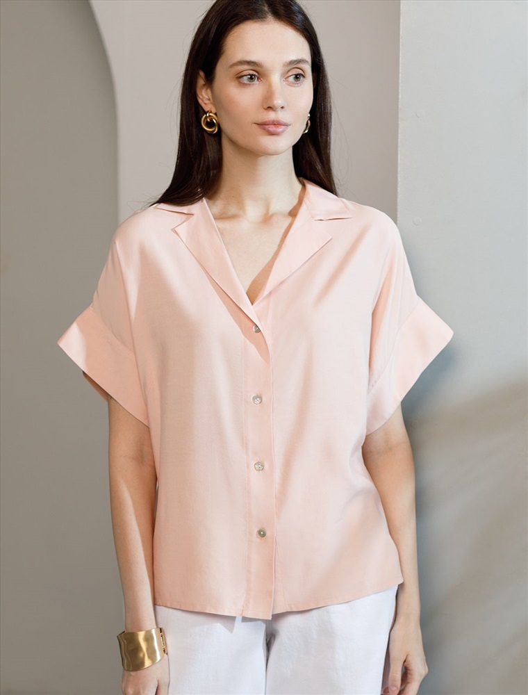 Состав: 55%Вис 45%Лиоцелл (Вис); Плотность: 115 Г/м2 Блузка пудрового цвета сочетает в себе комфорт и элегантность благодаря материалу из вискозы с лиоцеллом. Аккуратный отложной воротник подчеркивает утонченность образа, а широкие короткие рукава привлекают внимание и делают силуэт современным. Спущенная линия плеча формирует расслабленный, но стильный внешний вид, что идеально для тех, кто ценит индивидуальность и уверенность в деталях. Крой продуман так, чтобы подчеркивать достоинства фигуры и на больших размерах, создавая гармоничный силуэт без лишних усилий. Ткань из вискозы с добавлением лиоцелла обеспечивает приятные ощущения и отличную посадку, струится на теле и охлаждает в жаркую погоду. При пошиве использована технология «чистый край» по всей длине центральной планки и низу изделия. Это признак премиум качества — «чистый край» вместо оверлока. Блузку можно носить с топом, не застегивая — при этом распахнутая блузка будет выглядеть максимально эстетично. Рубашка легко впишется как в деловой гардероб, так и в повседневный стиль, позволяя выглядеть безупречно независимо от ситуации.