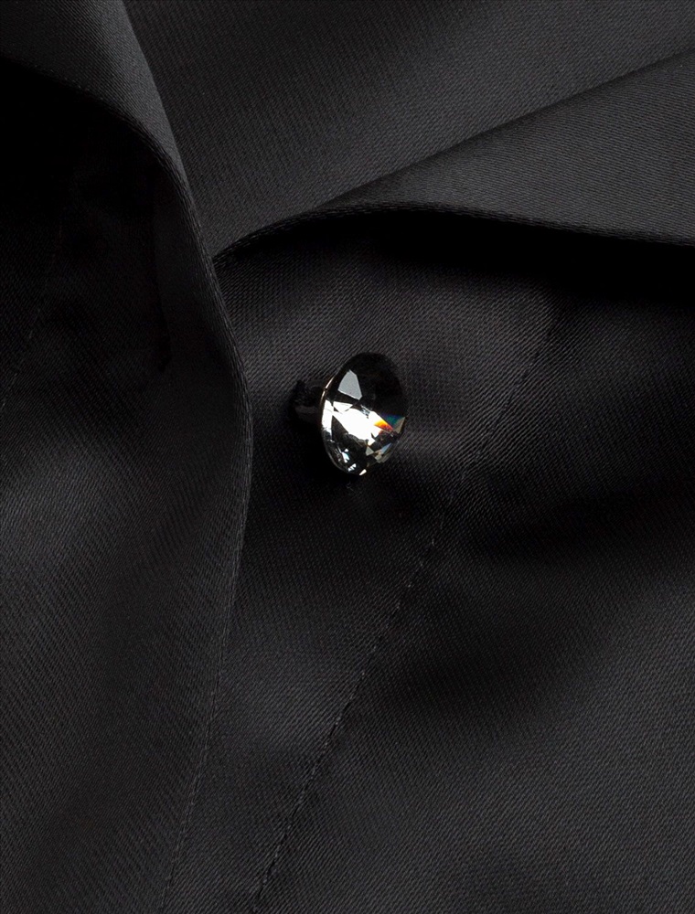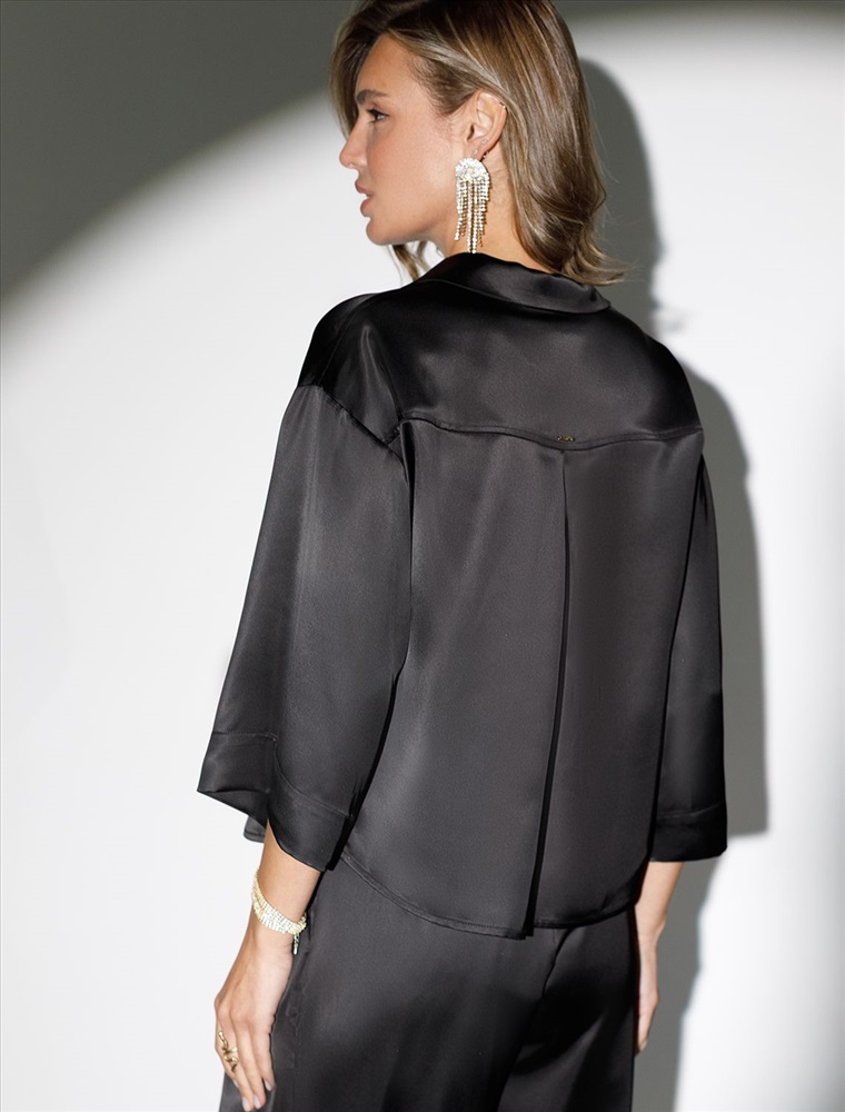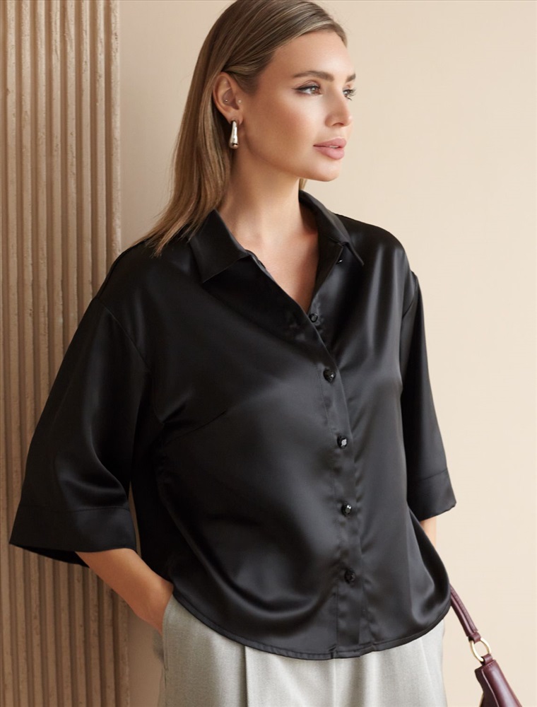 Элегантная блузка черного цвета на пуговицах выполнена из плотного струящегося сатина, который мягко ложится по фигуре и создает эффектную посадку. Отложной воротник придает образу женственную и изящную нотку. Материал отличается дышащей структурой, благодаря чему комфорт сохраняется даже в течение всего дня. Широкие рукава обеспечивают свободу движений и подходят для полных рук, делая блузку универсальной для разных типов фигур, в том числе для больших размеров. Красивая гладкая фактура материала подчеркивает утонченность изделия, добавляя легкое сияние к любому образу. Благодаря продуманному крою эта рубашка смотрится стильно как в повседневной жизни, так и на особых мероприятиях. Ткань практична, она приятна на ощупь, легко ухаживается и долго сохраняет первоначальный вид даже после многократных стирок и активной носки.