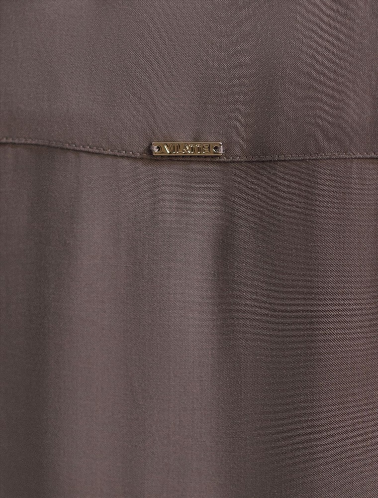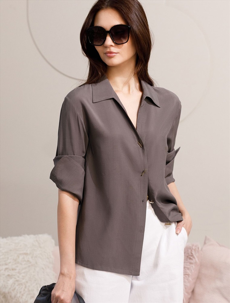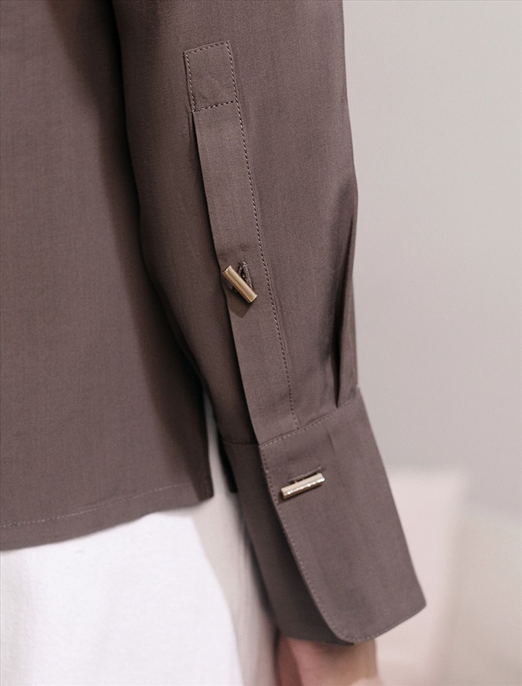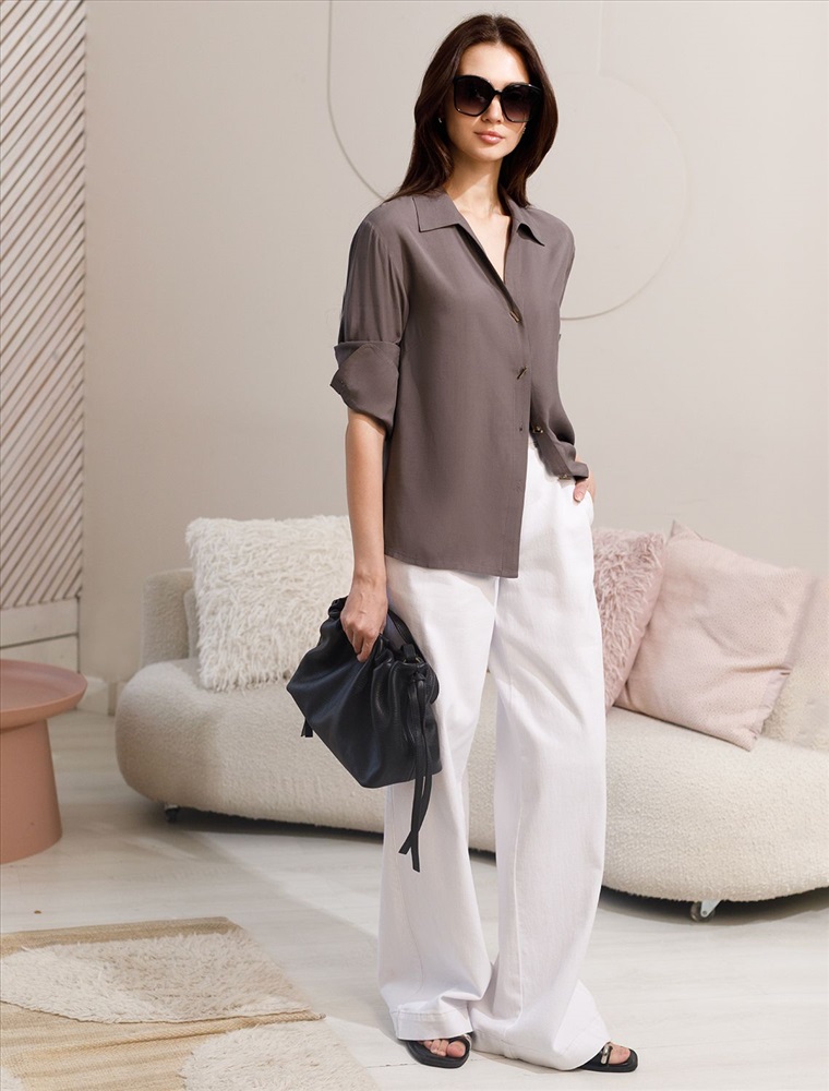 Блузка кофейного цвета сочетает в себе комфорт и элегантность благодаря материалу из вискозы с лиоцеллом. Аккуратный отложной воротник подчеркивает утонченность образа, а продолговатые металлические пуговицы золотистого цвета добавляют выразительный акцент и придают блузке благородный вид. Широкие манжеты на рукавах привлекают внимание и делают силуэт современным. Спущенная линия плеча формирует расслабленный, но стильный внешний вид, что идеально для тех, кто ценит индивидуальность и уверенность в деталях. Крой продуман так, чтобы подчеркивать достоинства фигуры и на больших размерах, создавая гармоничный силуэт без лишних усилий. Ткань из вискозы с добавлением лиоцелла обеспечивает приятные ощущения и отличную посадку, струится на теле и охлаждает в жаркую погоду. При пошиве использована технология «чистый край» по всей длине центральной планки и низу изделия. Это признак премиум качества — «чистый край» вместо оверлока. Блузку можно носить с топом, не застегивая — при этом распахнутая блузка будет выглядеть максимально эстетично.Рубашка легко впишется как в деловой гардероб, так и в повседневный стиль, позволяя выглядеть безупречно независимо от ситуации.