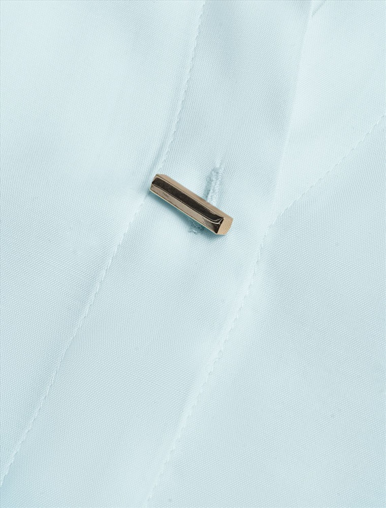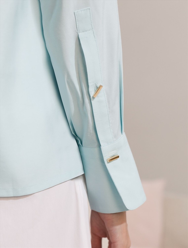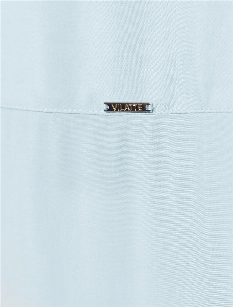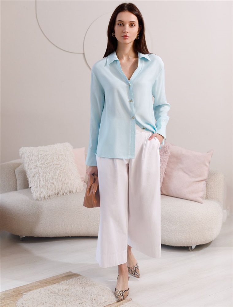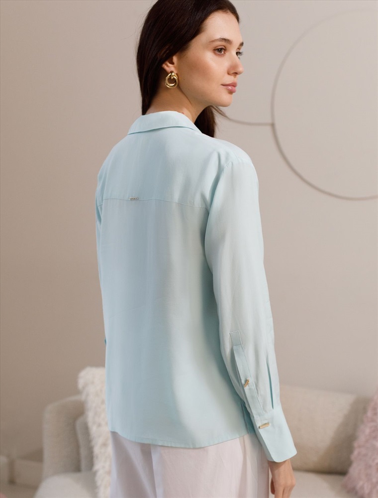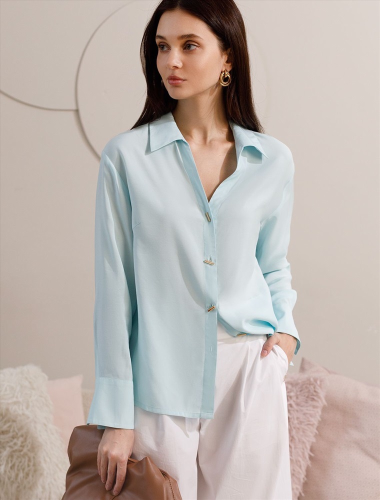 Блузка светло-лазурного цвета сочетает в себе комфорт и элегантность благодаря материалу из вискозы с лиоцеллом. Аккуратный отложной воротник подчеркивает утонченность образа, а продолговатые металлические пуговицы золотистого цвета добавляют выразительный акцент и придают блузке благородный вид. Широкие манжеты на рукавах привлекают внимание и делают силуэт современным. Спущенная линия плеча формирует расслабленный, но стильный внешний вид, что идеально для тех, кто ценит индивидуальность и уверенность в деталях. Крой продуман так, чтобы подчеркивать достоинства фигуры и на больших размерах, создавая гармоничный силуэт без лишних усилий. Ткань из вискозы с добавлением лиоцелла обеспечивает приятные ощущения и отличную посадку, струится на теле и охлаждает в жаркую погоду. При пошиве использована технология «чистый край» по всей длине центральной планки и низу изделия. Это признак премиум качества — «чистый край» вместо оверлока. Блузку можно носить с топом, не застегивая — при этом распахнутая блузка будет выглядеть максимально эстетично.Рубашка легко впишется как в деловой гардероб, так и в повседневный стиль, позволяя выглядеть безупречно независимо от ситуации.