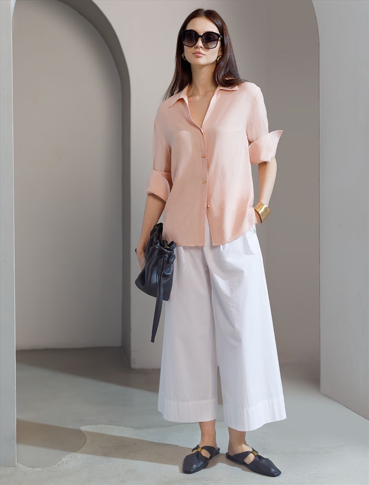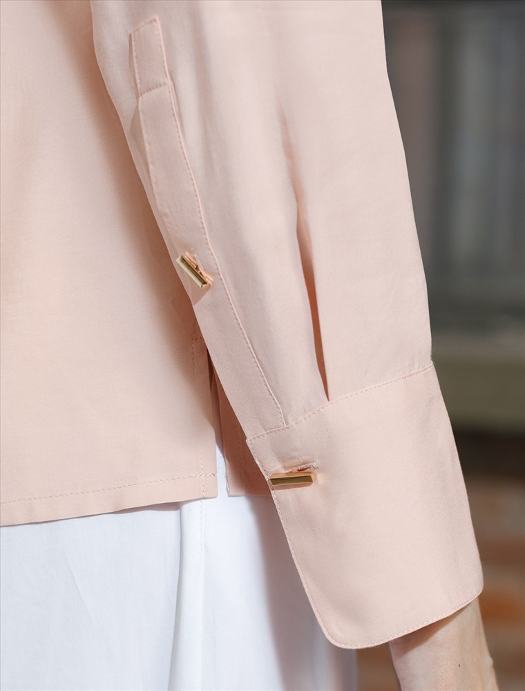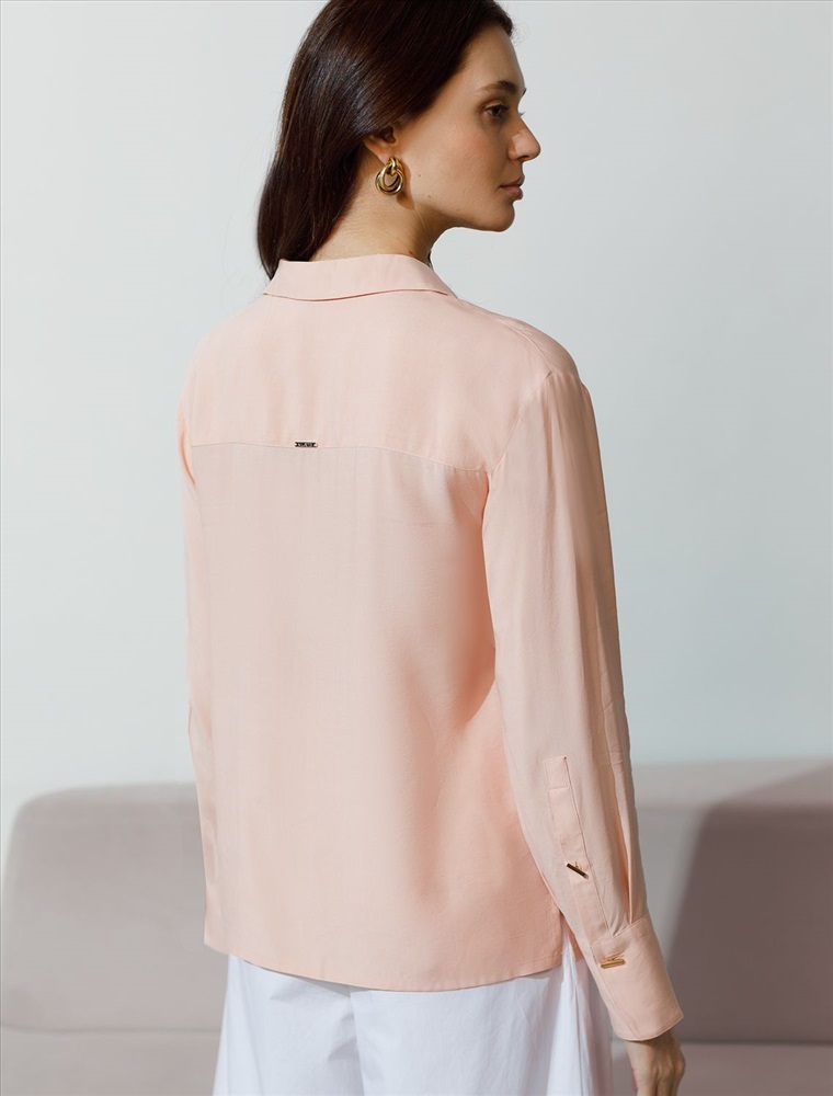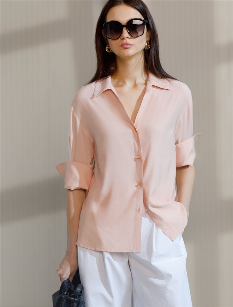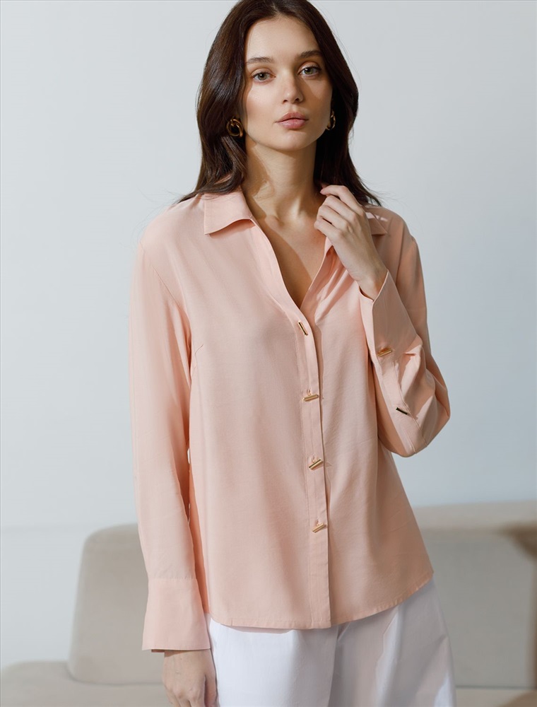 Блузка пудрового цвета сочетает в себе комфорт и элегантность благодаря материалу из вискозы с лиоцеллом. Аккуратный отложной воротник подчеркивает утонченность образа, а продолговатые металлические пуговицы золотистого цвета добавляют выразительный акцент и придают блузке благородный вид. Широкие манжеты на рукавах привлекают внимание и делают силуэт современным. Спущенная линия плеча формирует расслабленный, но стильный внешний вид, что идеально для тех, кто ценит индивидуальность и уверенность в деталях. Крой продуман так, чтобы подчеркивать достоинства фигуры и на больших размерах, создавая гармоничный силуэт без лишних усилий. Ткань из вискозы с добавлением лиоцелла обеспечивает приятные ощущения и отличную посадку, струится на теле и охлаждает в жаркую погоду. При пошиве использована технология «чистый край» по всей длине центральной планки и низу изделия. Это признак премиум качества — «чистый край» вместо оверлока. Блузку можно носить с топом, не застегивая — при этом распахнутая блузка будет выглядеть максимально эстетично.Рубашка легко впишется как в деловой гардероб, так и в повседневный стиль, позволяя выглядеть безупречно независимо от ситуации.