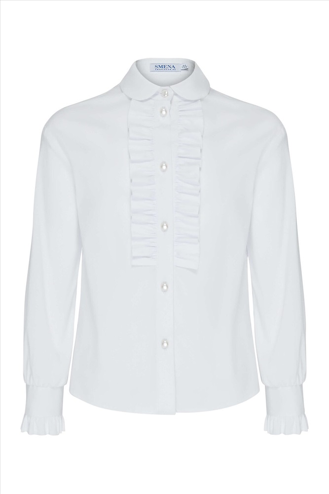 Классическая блузка из смесового хлопка полуприлегающего силуэта с отложным воротником. Длинные спущенные рукава с манжетами, по краю манжет выполнена декоративная оборка. Полочка декорирована оборками по центральной застёжке с пуговицами Высокое содержание хлопка в составе обеспечивает отличную воздухопроницаемость и комфорт в повседневной носке.