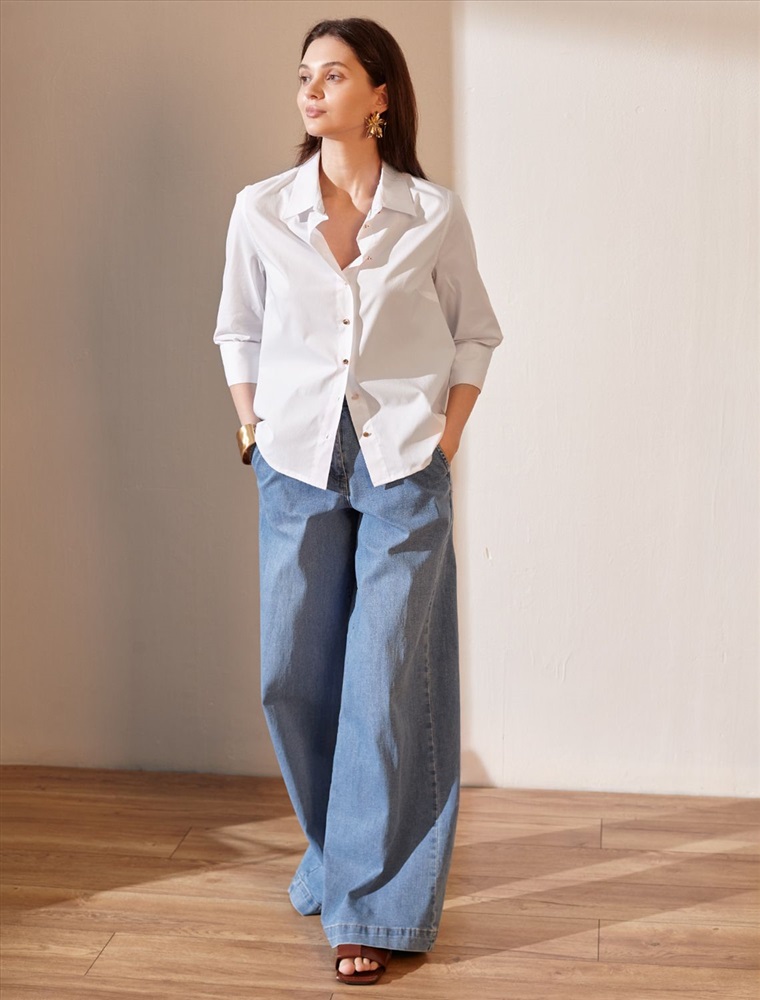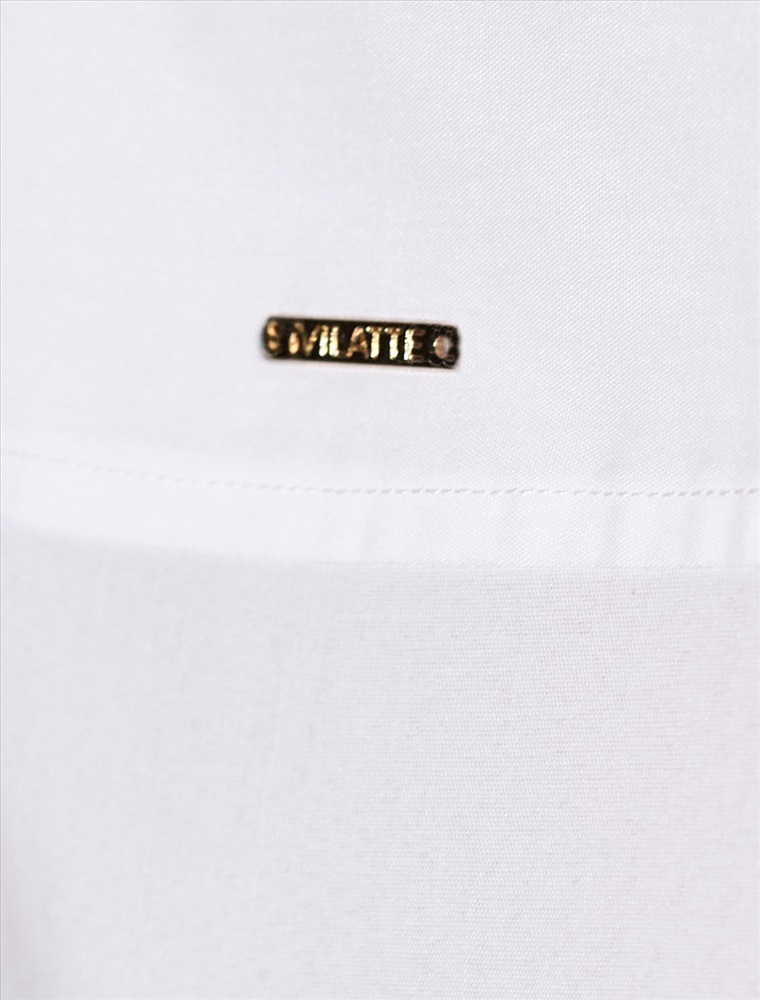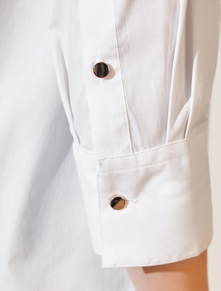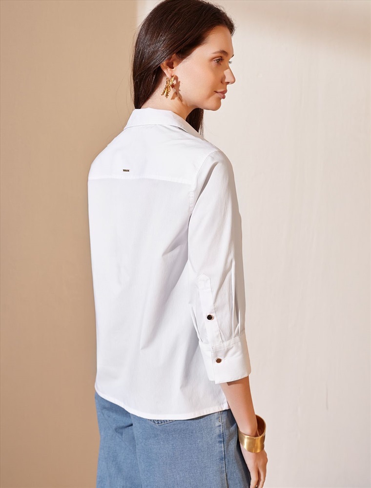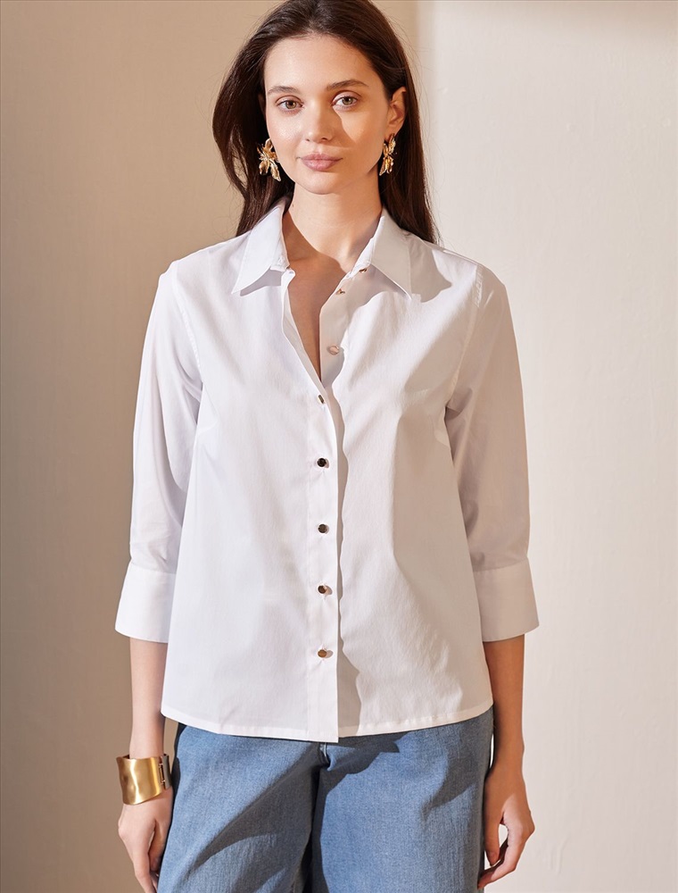 Стильная блузка белого цвета создаст эффектный образ на весну и лето. Смешанный состав ткани идеален для деловых блузок: хлопок приятен к телу, полиэстер повышает долговечность, а ПУ (эластан) придает комфортную растяжимость. Свободный крой с рукавом 3/4 создает эффект легкой непринужденности и комфорта, а манжеты на рукавах добавляют аккуратности и завершенности образу. Отложной воротник придает блузке классическую нотку, которая гармонично сочетается в деловом образе. Пуговицы изготовлены в технике double polish (двойная полировка), которая обеспечивает долговечность и красивый блеск. Такая рубашка станет великолепным выбором для тех, кто ценит удобство и стиль одновременно. Повседневная блузка удачно сочетается с различными предметами гардероба, позволяя создавать стильные и практичные образы в любую погоду.