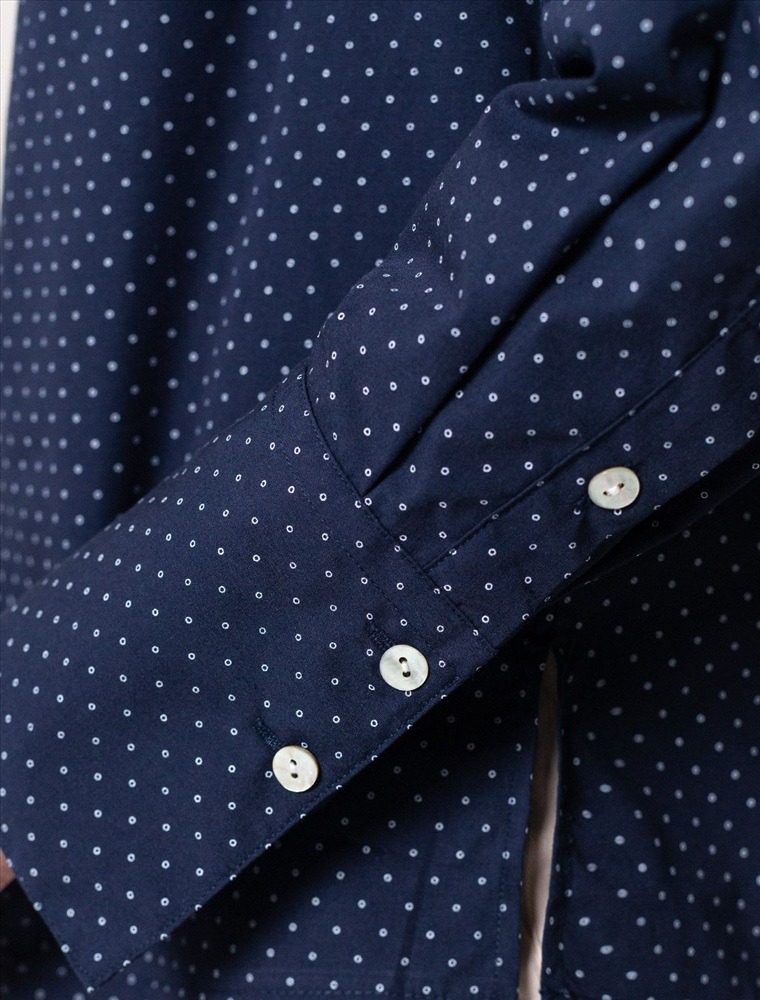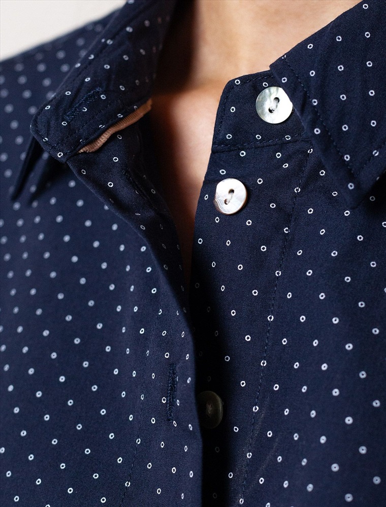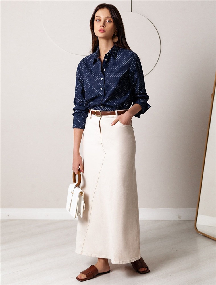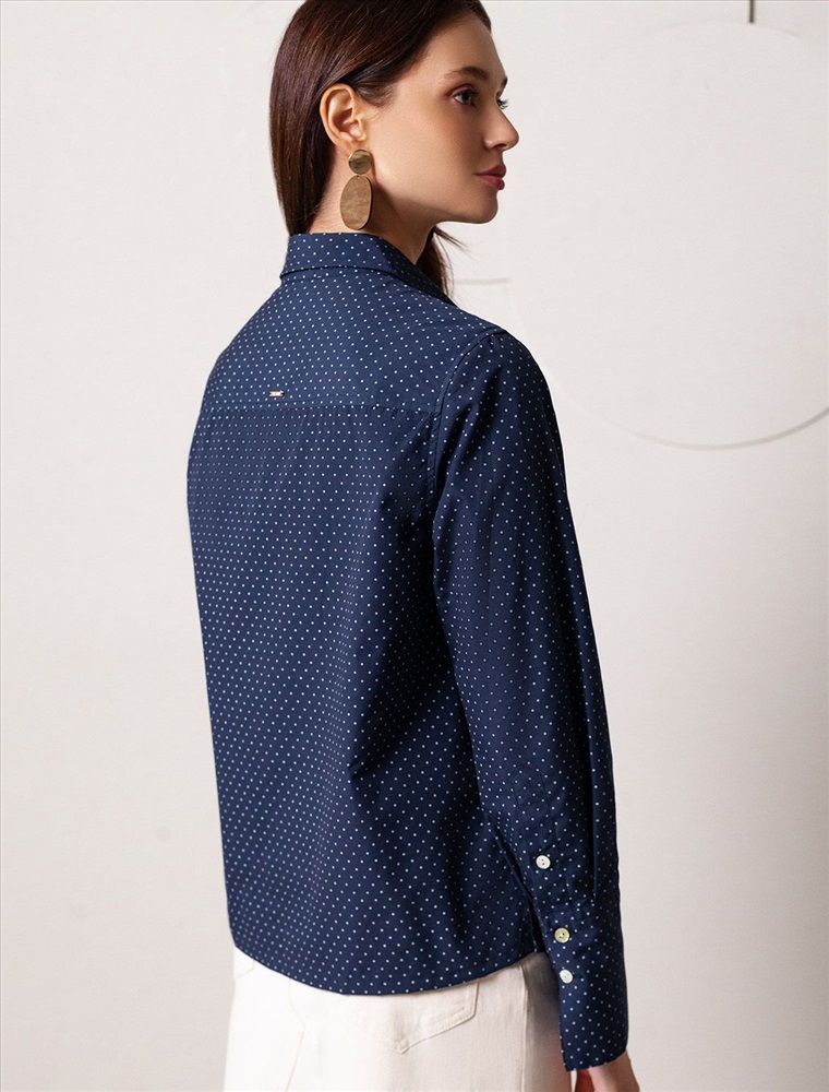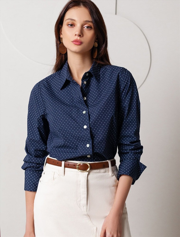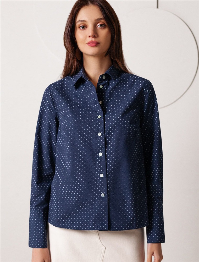 Блузка свободного силуэта темно-синего цвета из хлопка идеально подходит для теплого сезона и порадует всех, кто ценит комфорт и стиль. Натуральный материал плотностью 109 Г/м2 обеспечивает приятное ощущение на теле и хорошо пропускает воздух, что особенно важно летом и весной. Блузка с длинным рукавом обладает высокой износостойкостью, что позволяет сохранять привлекательный внешний вид даже при регулярном использовании. Ткань хорошо держит форму после стирки и надолго остается аккуратной. Эластан в составе обеспечивает отличную посадку на любую фигуру. Классическая рубашка с отложным воротником и широкими манжетами формирует актуальный образ, подходящий как для работы, так и для повседневных прогулок. Пуговицы на планке добавляют практичности и позволяют регулировать степень открытости, что также способствует созданию различных вариантов ношения, например, в качестве второго слоя. Прямой свободный крой рубашки не сковывает движения и создает ощущение легкости, а принт в мелкий горошек делает образ выраженным, современным и подчеркивает индивидуальность. Повседневная блузка гармонично сочетается с любыми низами, что делает ее универсальной частью гардероба.