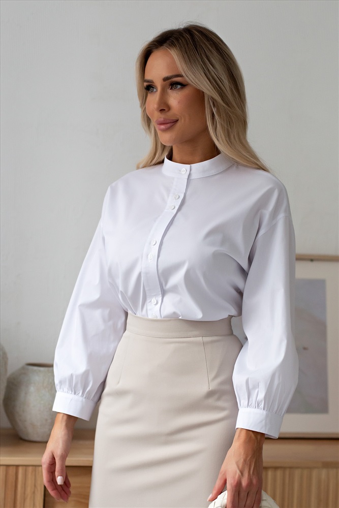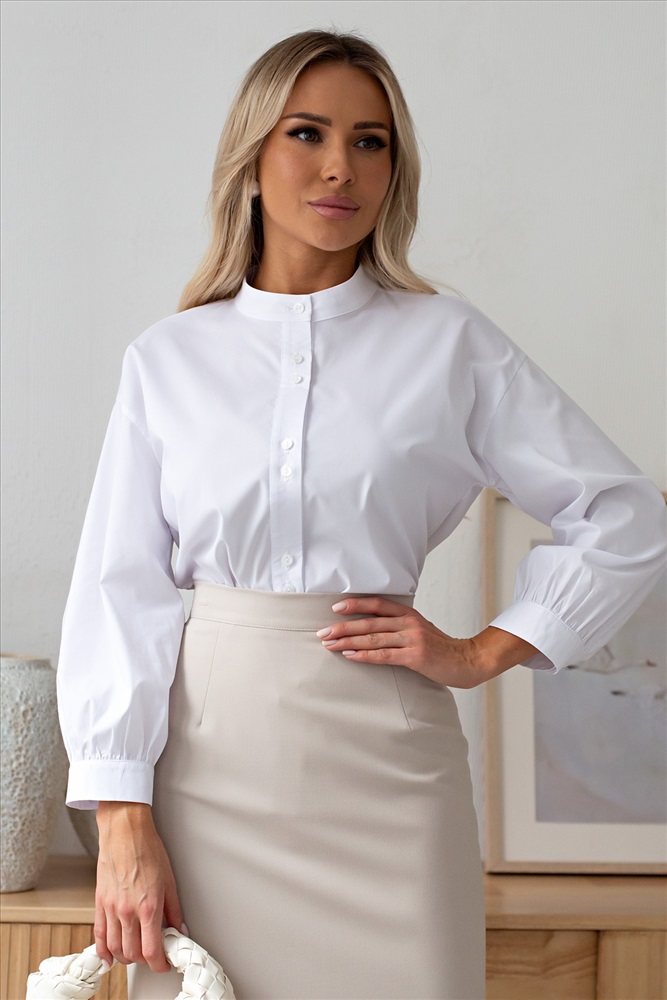 Горловина оформлена воротником-стойка. По переду планка с застежкой на петли и пуговицы.