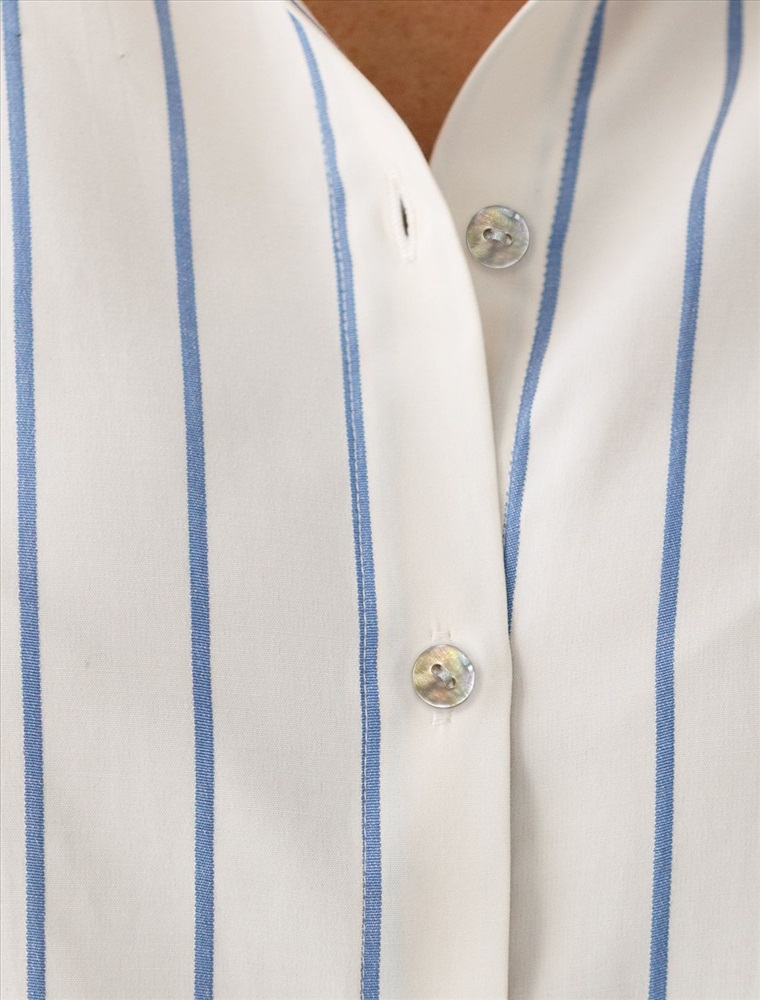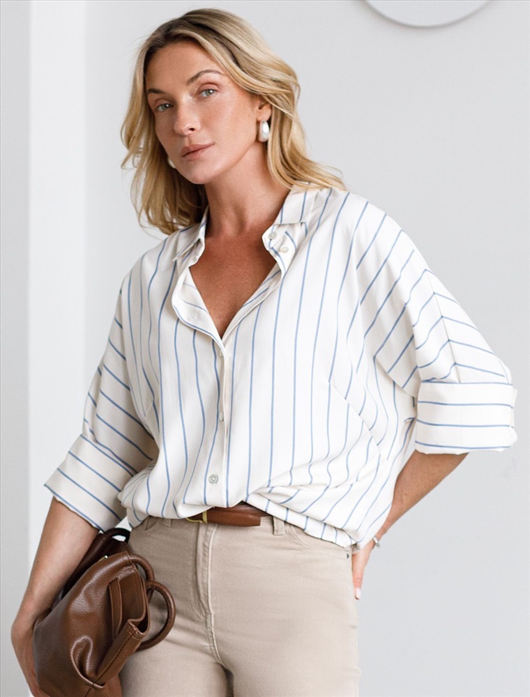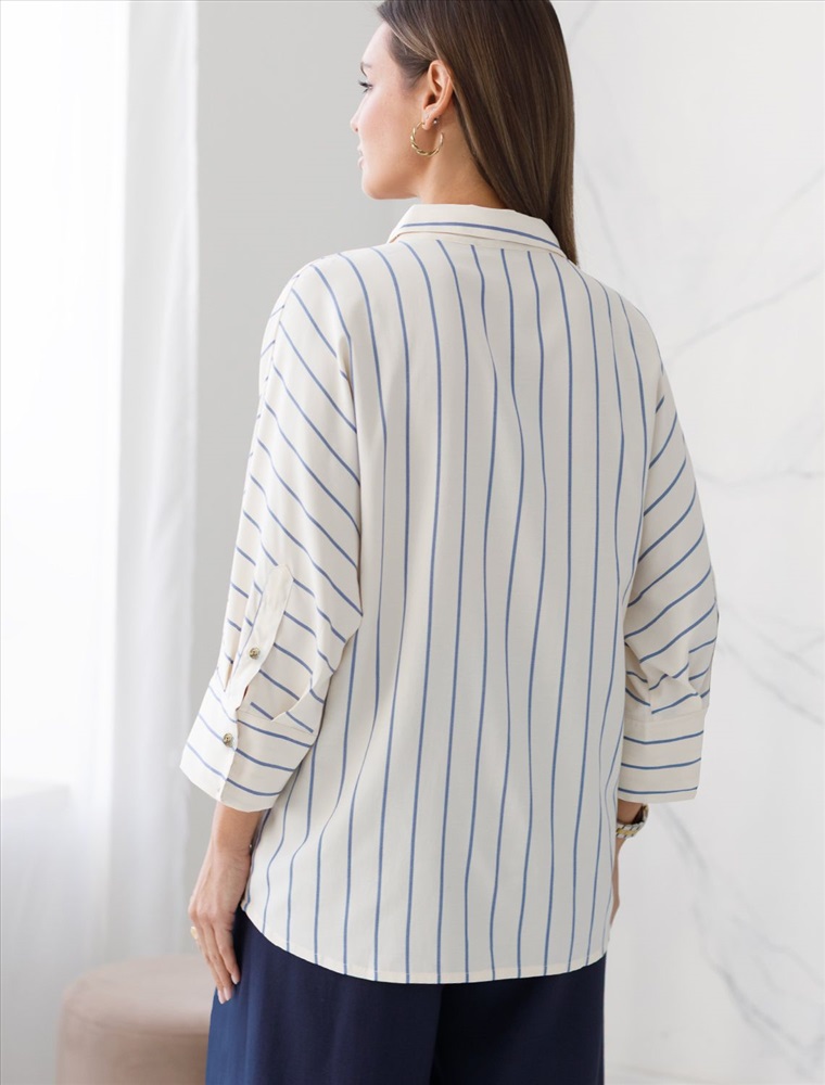 Стильная блузка молочного цвета в голубую полоску идеально держит форму и подчеркивает любую фигуру. Свободный крой с цельнокроеным рукавом 3/4 создает эффект легкой непринужденности и комфорта, а манжеты на рукавах добавляют аккуратности и завершенности образу. Отложной воротник придает блузке классическую нотку, которая гармонично сочетается в деловом образе. Хлопок гарантирует отличную посадку, подчеркивая достоинства и скрывая недостатки, при этом сохраняет свежесть на протяжении всего дня. Такая рубашка станет великолепным выбором для тех, кто ценит удобство и стиль одновременно. Модель удачно сочетается с различными предметами гардероба, позволяя создавать стильные и практичные образы в любую погоду.
