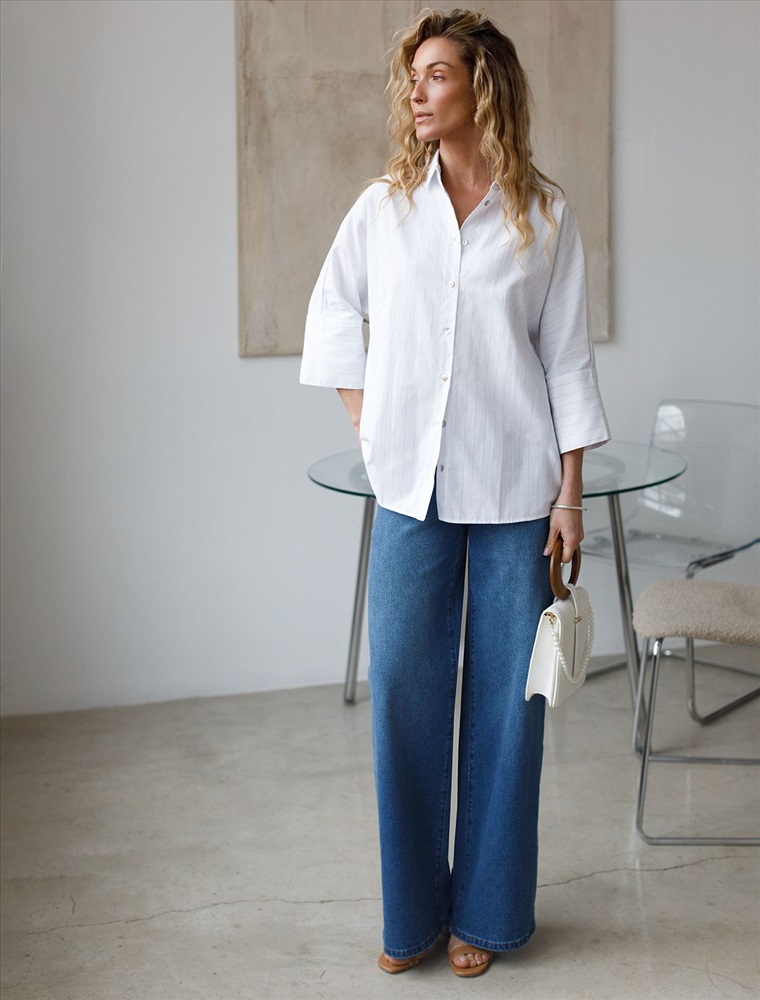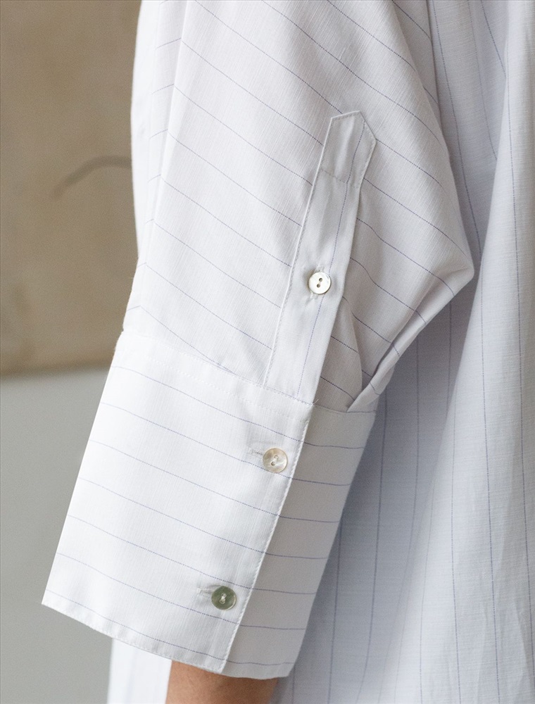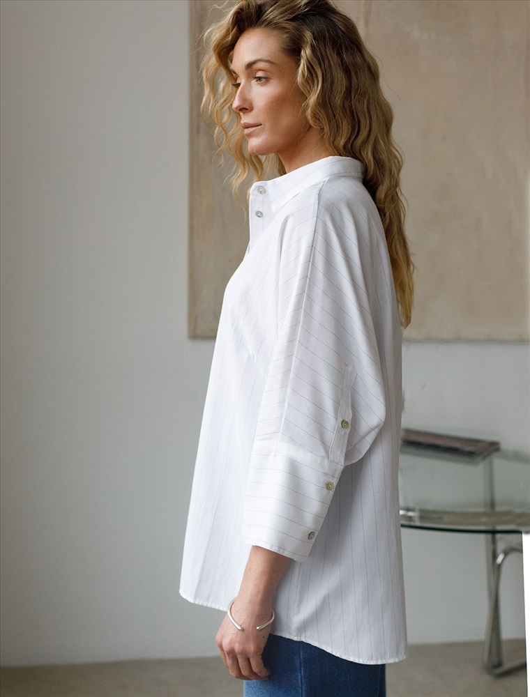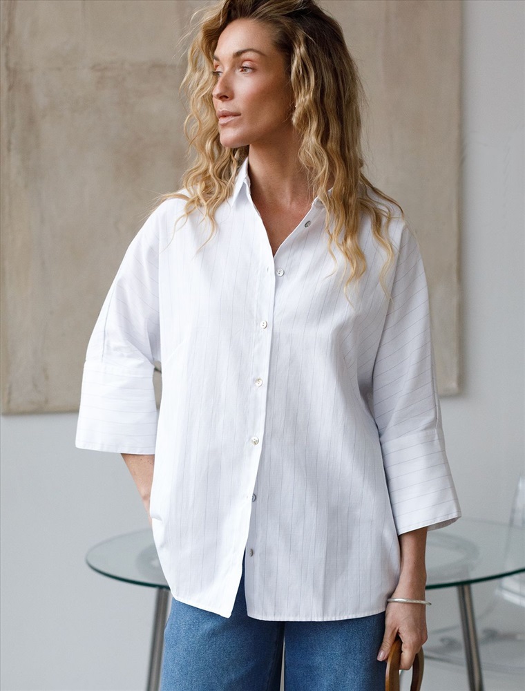 Стильная блузка белого цвета в лавандовую полоску идеально держит форму и подчеркивает любую фигуру. Свободный крой с цельнокроеным рукавом 3/4 создает эффект легкой непринужденности и комфорта, а манжеты на рукавах добавляют аккуратности и завершенности образу. Отложной воротник придает блузке классическую нотку, которая гармонично сочетается в деловом образе. Хлопок с добавлением льна гарантирует отличную посадку, подчеркивая достоинства и скрывая недостатки, при этом сохраняет свежесть на протяжении всего дня. Такая рубашка станет великолепным выбором для тех, кто ценит удобство и стиль одновременно. Модель удачно сочетается с различными предметами гардероба, позволяя создавать стильные и практичные образы в любую погоду.