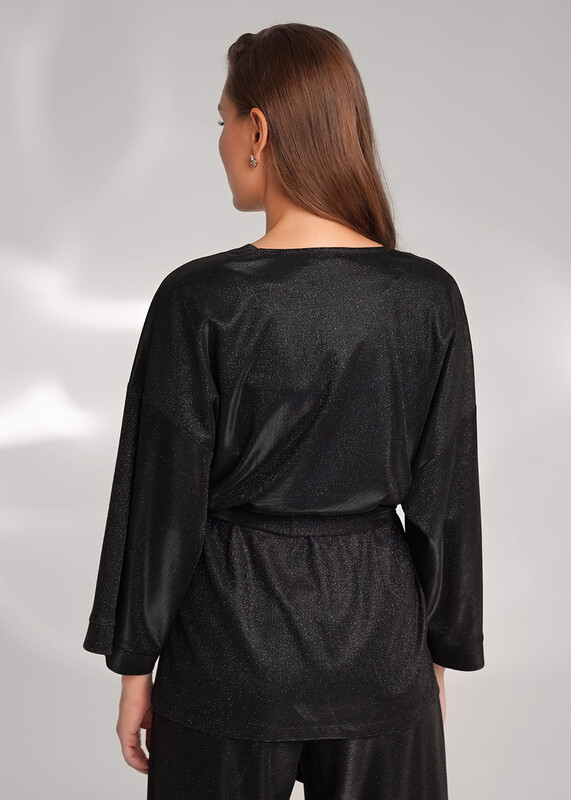 Блузка-кимано из трикотажного полотна с блеском. Спущенный рукав, внизу тритачной манжет. По борту притачная планка. По бокам разрезы. Сьемный пояс.