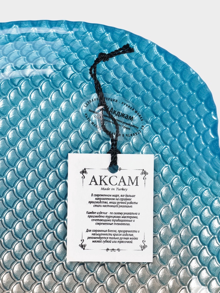 Фигурная плоская форма рыбы с рельефной текстурой напоминает море и океан, подчеркивая тематику посуды и добавляя глубину визуальному восприятию.