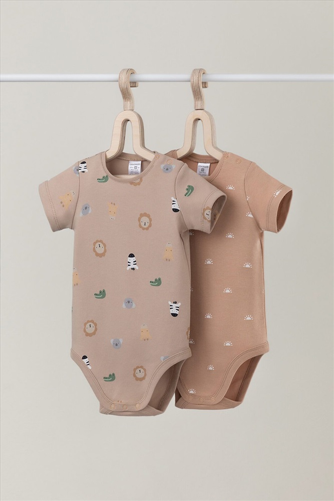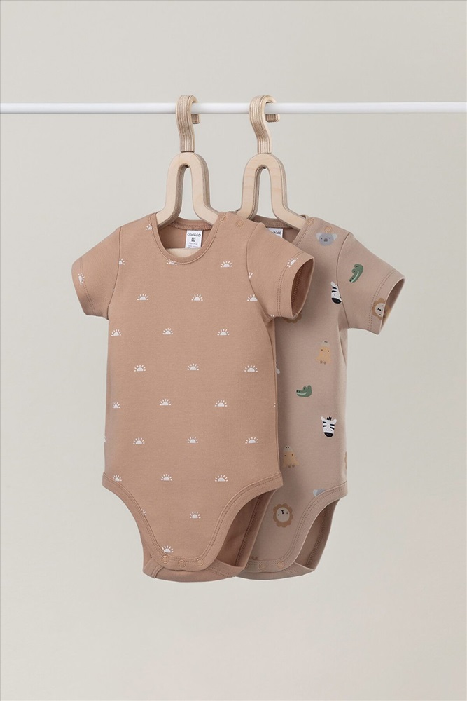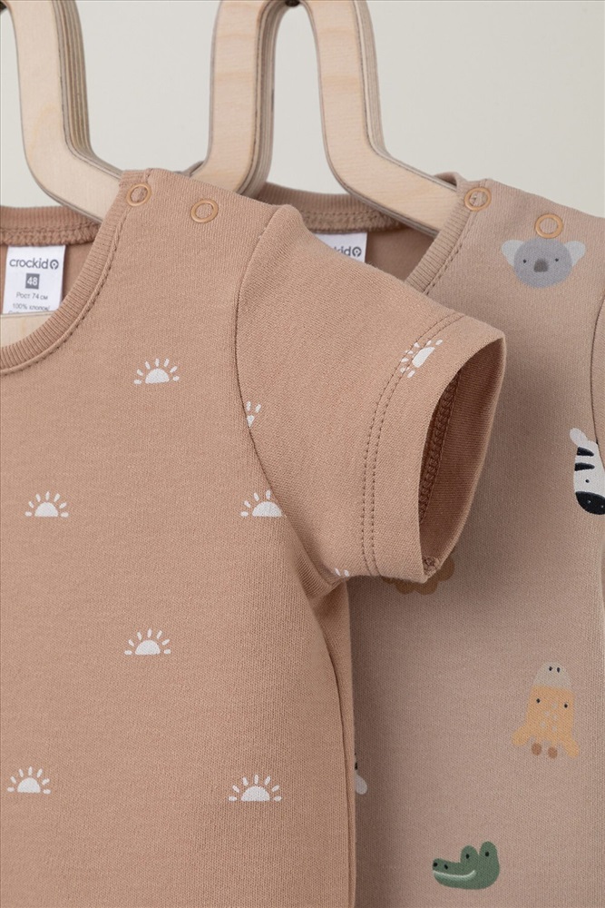 Боди в упаковке 2 шт для новорожденных из мягкого, эластичного трикотажа произведенного из натурального хлопка. Изделие застегивается на кнопки. Оригинальная набивка выполнена из стойких, гипоаллергенных, текстильных красителей. Все трикотажные полотна производятся в соответсвии с нормами Швейцарского сертификата ЭкоТекс.