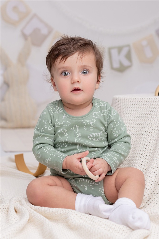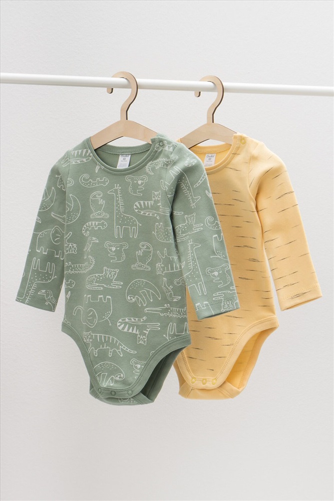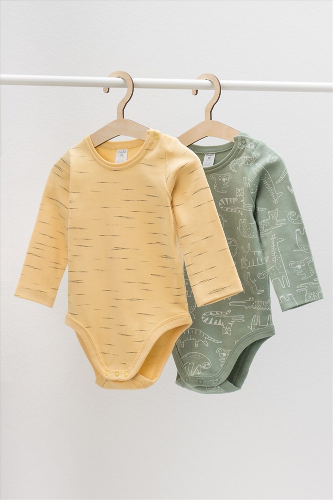 Боди в упаковке 2 шт для новорожденных из мягкого, эластичного трикотажа произведенного из натурального хлопка. Изделие застегивается на кнопки. Оригинальная набивка выполнена из стойких, гипоаллергенных, текстильных красителей. Все трикотажные полотна производятся в соответсвии с нормами Швейцарского сертификата ЭкоТекс.