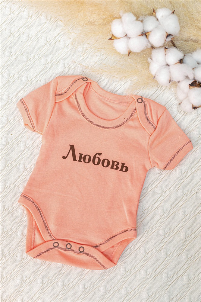 Боди для новорожденных с коротким рукавом из интерлока в цвете персик. За счет застежек-кнопок в нижней части и на пересечении горловины, переодевание малыша будет удобным. Бейка в цвет основного полотна на горловине, рукавах и по низу придает изделию завершенный вид. Спереди нанесен принт, который добавит изюминку и индивидуальность образу.