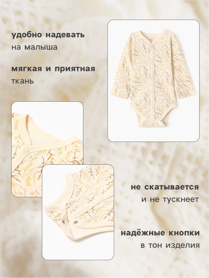 Габариты: 23 x 17 x 1 В боксе: 100 шт Габариты товара: 18 см × 20 см × 1,3 см Размер: 22 Рост, см: 68, 62 Рекомендации по уходу: Бережный режим глажки, Стирка при 30 °С, Не отбеливать Страна: Узбекистан Состав: Хлопок 100% Материалы: хлопок Фасовка: по 1 шт Сертификат: ЕАС Цвет: Бежевый Для кого: Для девочки Назначение: Повседневная Ткань: Интерлок-пенье Плотность, г/м²: 180 Сезон: Всесезонный Вид застёжки: Кнопка Тематика: Растительный орнамент Длина рукава: Длинный Вырез горловины: Круглый Декоративные элементы: Без элементов Состав ткани: Хлопок Комментарии к товару