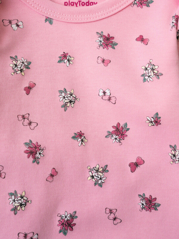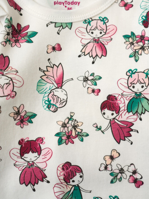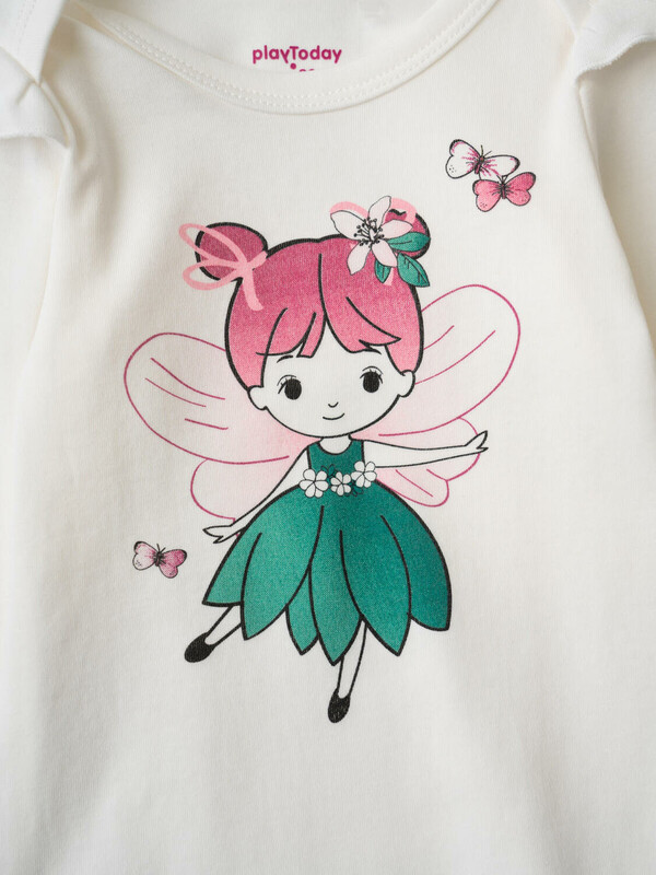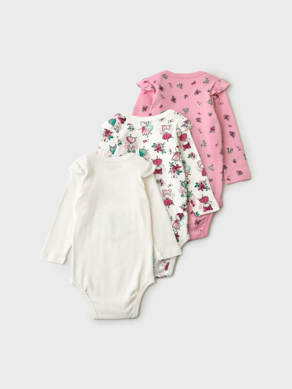 Комплект из трёх боди для новорождённой девочки. Все изделия выполнены из мягкой хлопковой ткани, с длинными рукавами и удобной застёжкой на кнопки снизу. Два ряда кнопок, боди растет вместе с малышом. У каждого боди — милые рюши на плечах и разный дизайн: одно с крупным принтом феи, второе — с принтом фей и цветов, третье — розовое с мелким цветочным рисунком.