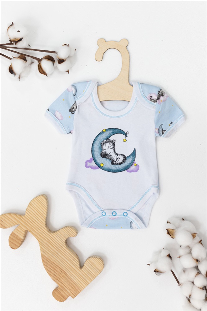 Сезон: Летний Состав: Хлопок 100% Цвет Номенклатуры: голубой Боди из интерлока. Короткий рукав, снизу застёжка на кнопки. Спереди нанесён принт. Комментарии к товару
