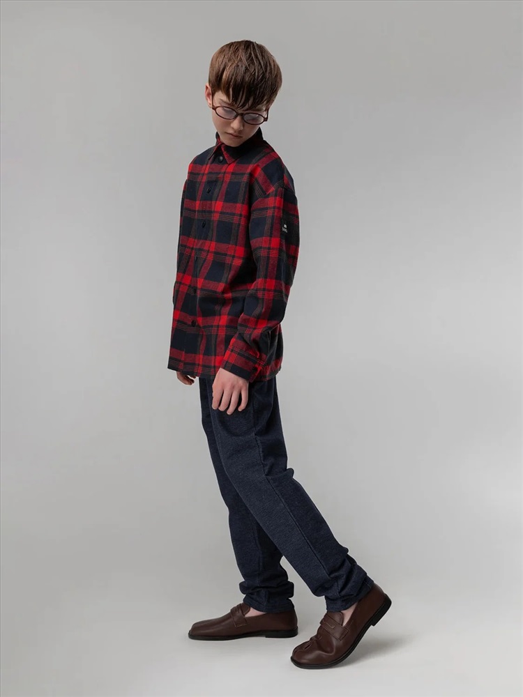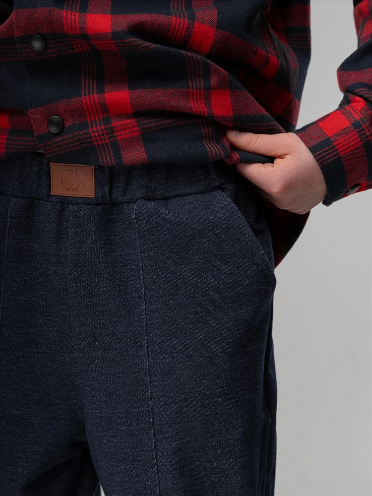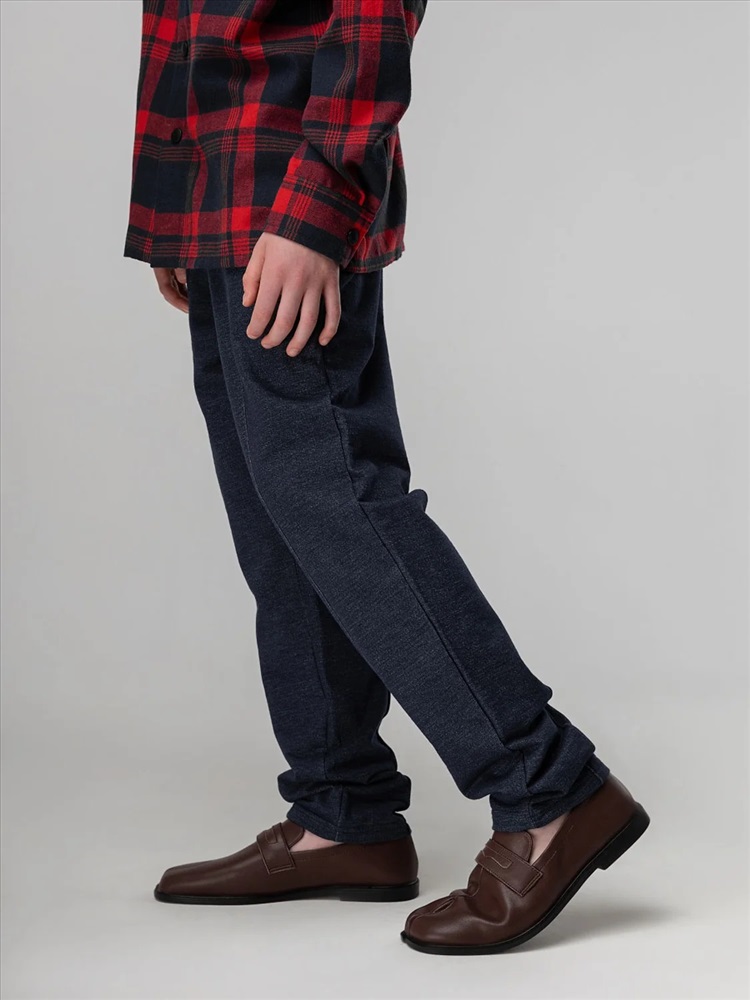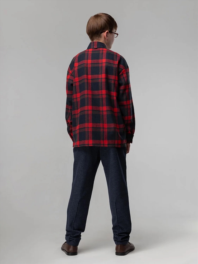 Брюки для детей школьного возраста. Брюки прямые слегка зауженные к низу на притачном поясе с внутренней резинкой. Брюки с боковыми карманами. Передние половинки с вертикальными рельефами от талии до низа изделия. На задних половинках декоративная отстрочка от низа изделия до уровня колен.