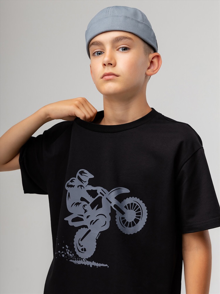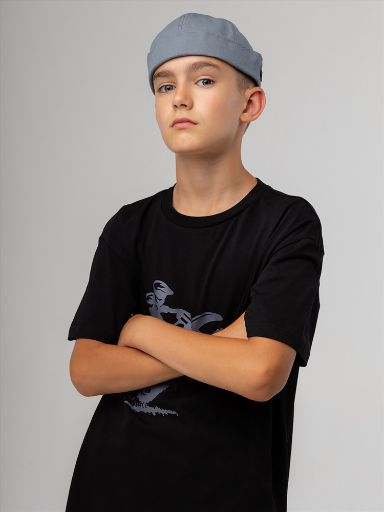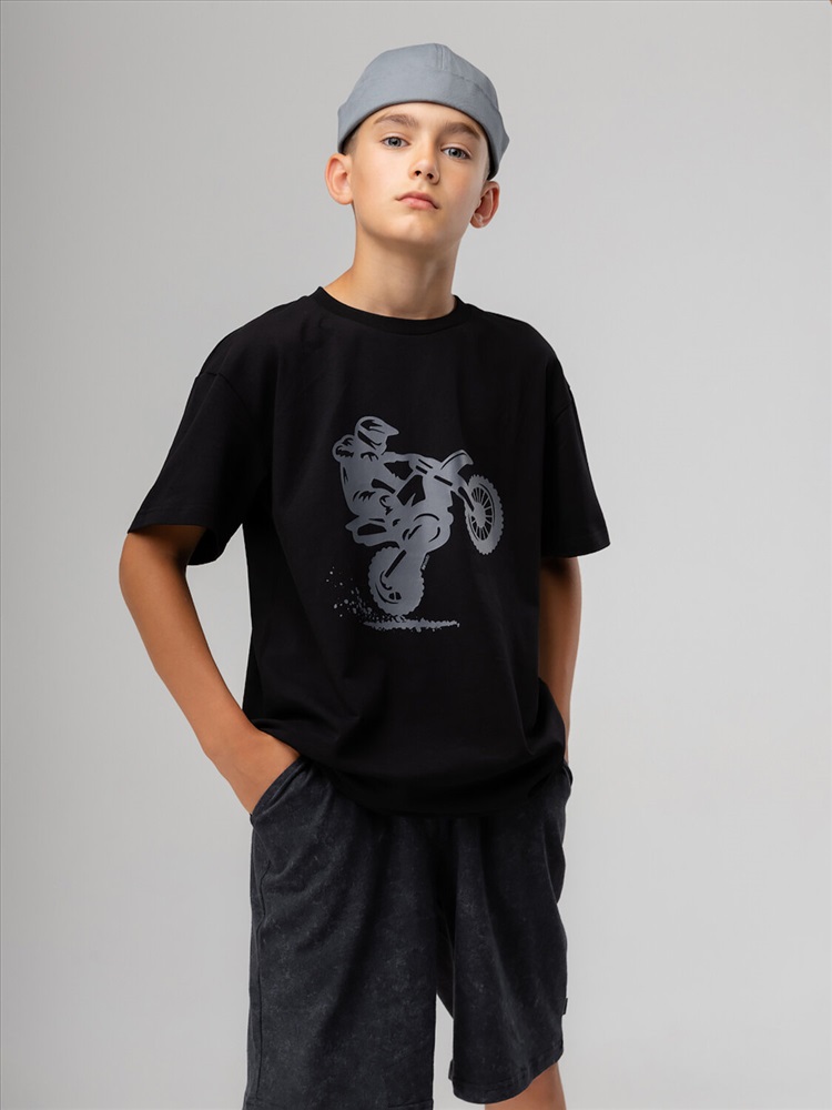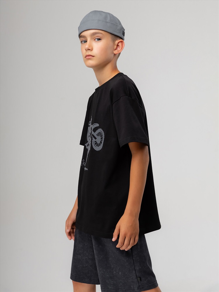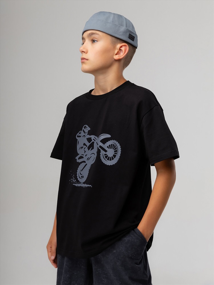 Футболка для детей школьного возраста. Футболка свободного силуэта с втачным коротким рукавом. Горловина футболки округлой формы. Низ изделия прямой.
