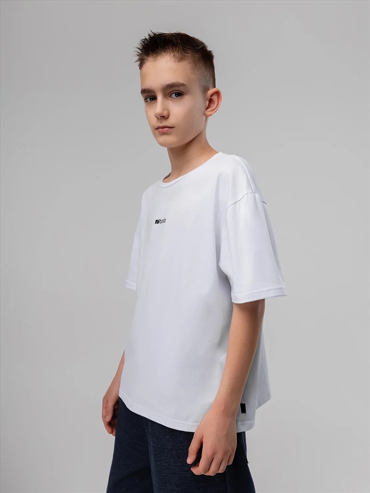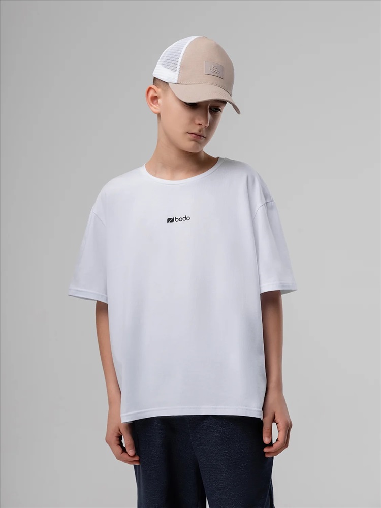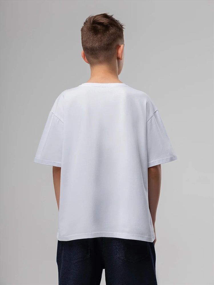 Футболка для детей школьного возраста. Футболка свободного силуэта с втачным коротким рукавом. Горловина футболки округлой формы. Низ изделия прямой. На полочке и спинке располагается принт.