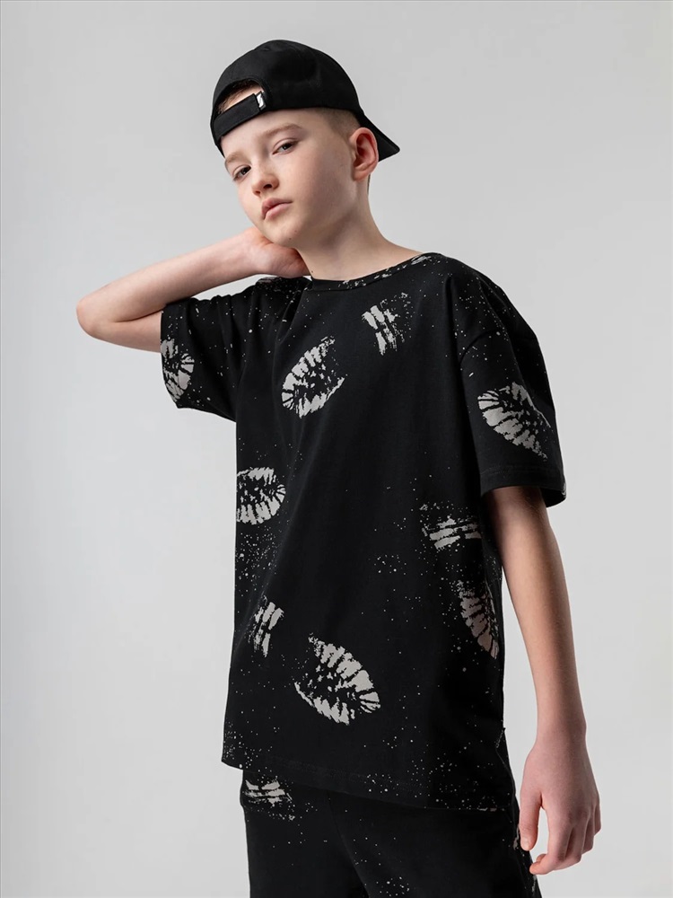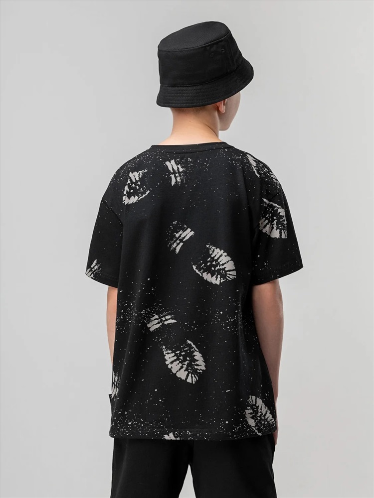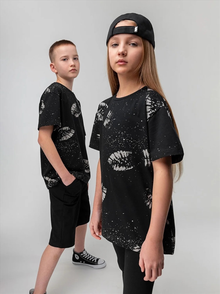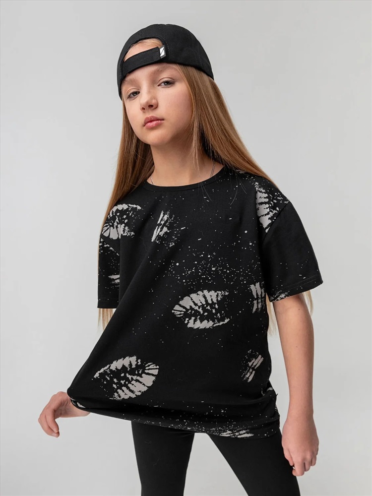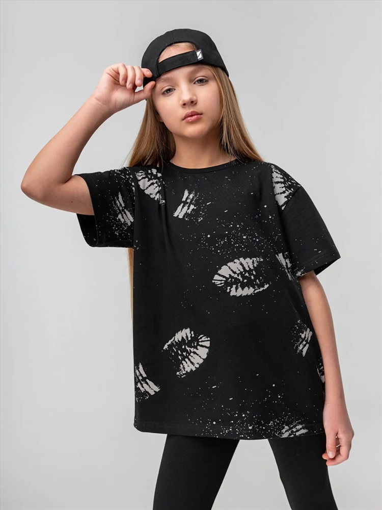 Футболка для детей школьного возраста. Футболка свободного силуэта с втачным коротким рукавом. Горловина футболки округлой формы. Низ изделия прямой. Состав: кулирная гладь 92% хлопок 8% лайкра