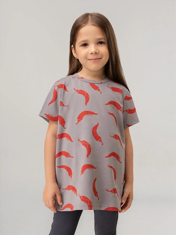 Свободная футболка с коротким рукавом. Горловина футболки округлой формы.