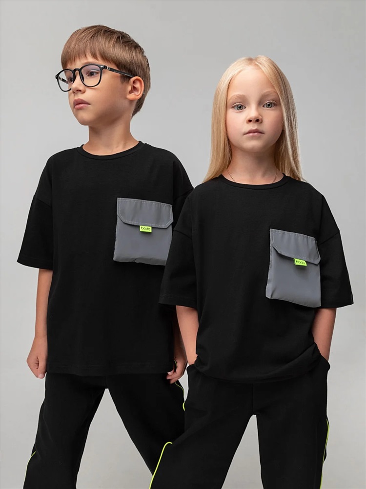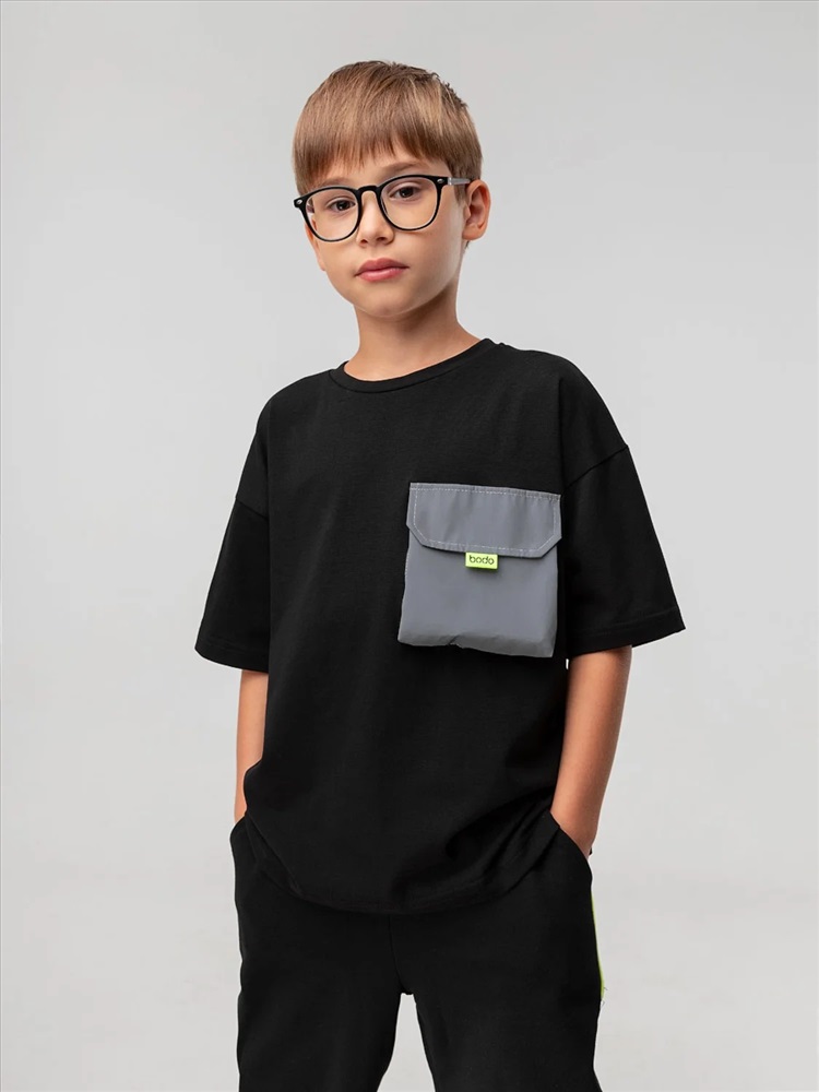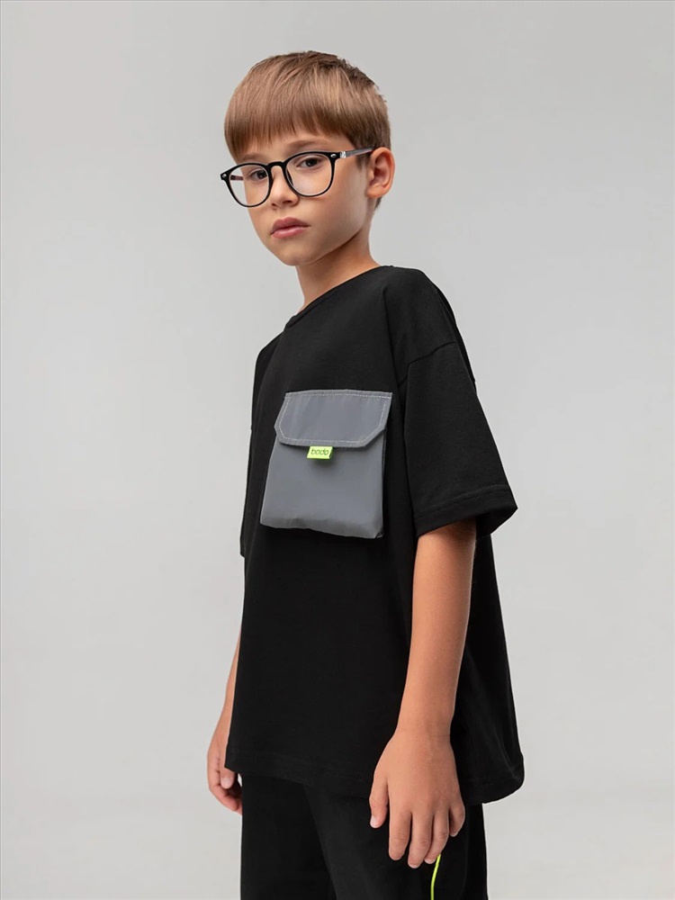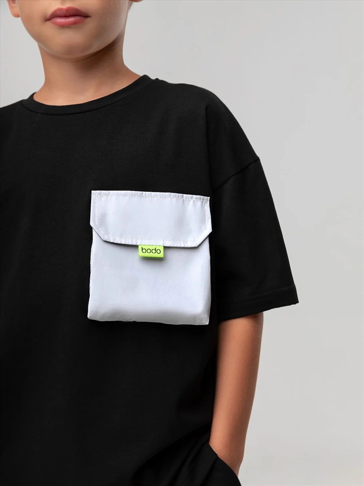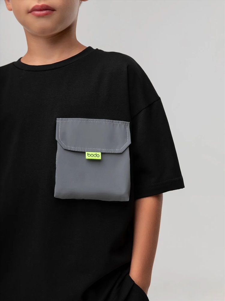 Свободная футболка со спущенным плечом, короткий рукав. На полочке расположен накладной карман с клапаном из дюспы.