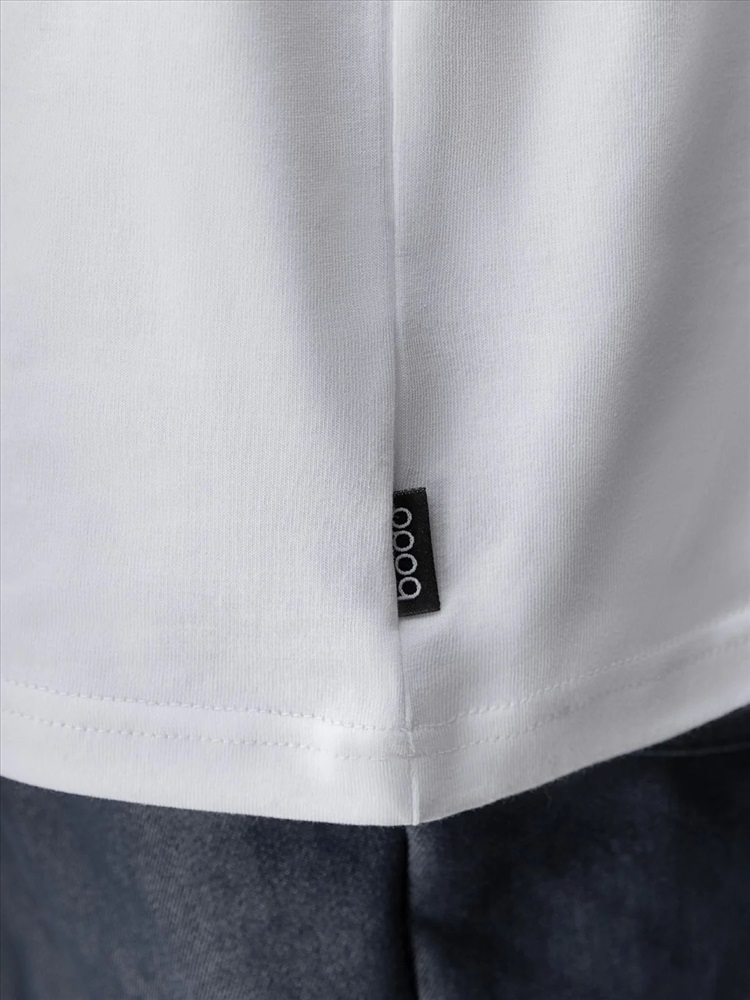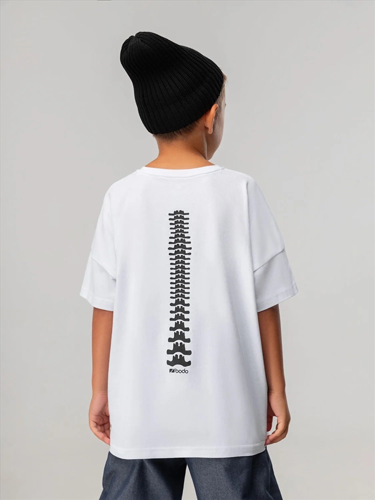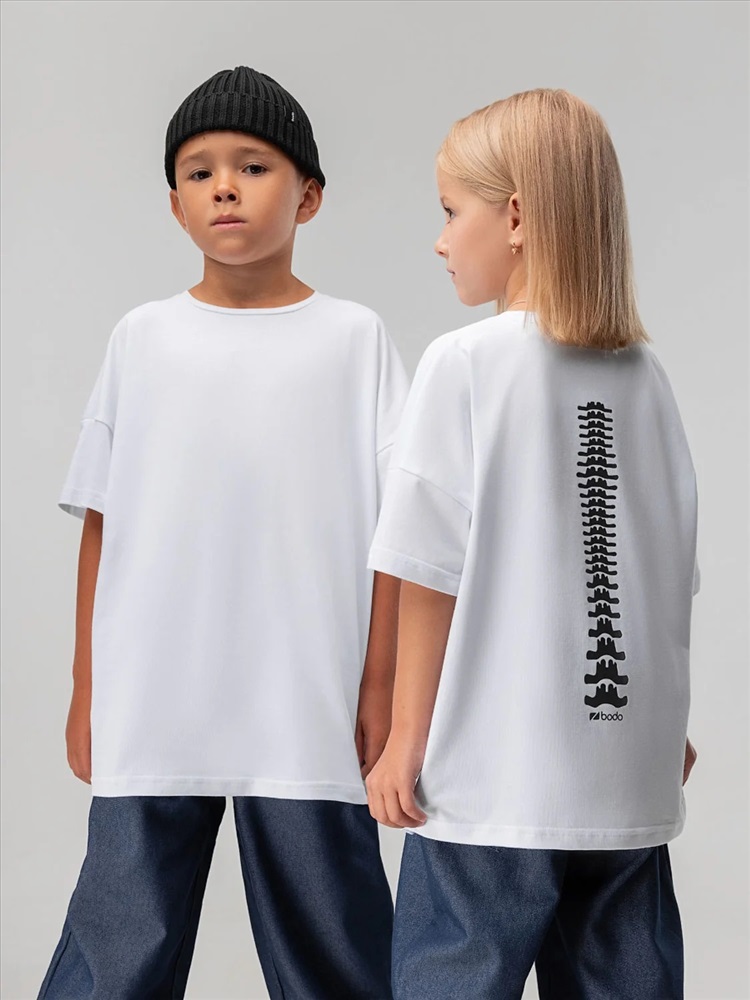 Свободная футболка с коротким рукавом. Горловина футболки округлой формы. Низ изделия прямой. На спинке расположен принт "позвоночник".