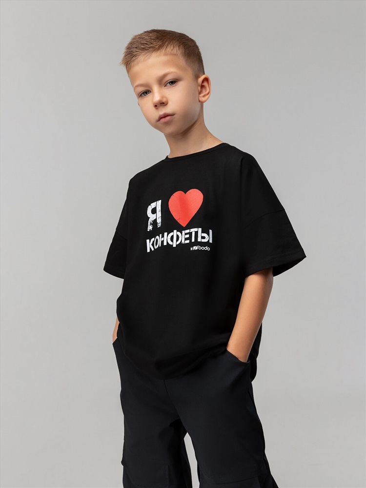 Производитель: Bodo; Российский размер: 98, 104; Возраст: 2,5-3; Обхват груди: 54-56; Обхват талии: 51-53; Обхват бедер: 55-57; Артикул поставщика: 4-475MU; Ткань: кулирная гладь; Состав: 92% хлопок 8% лайкра; Год: 2025; Страна: Россия Свободная футболка с коротким рукавом. Горловина футболки округлой формы. Низ изделия прямой. Принт на полочке " Я люблю конфеты"