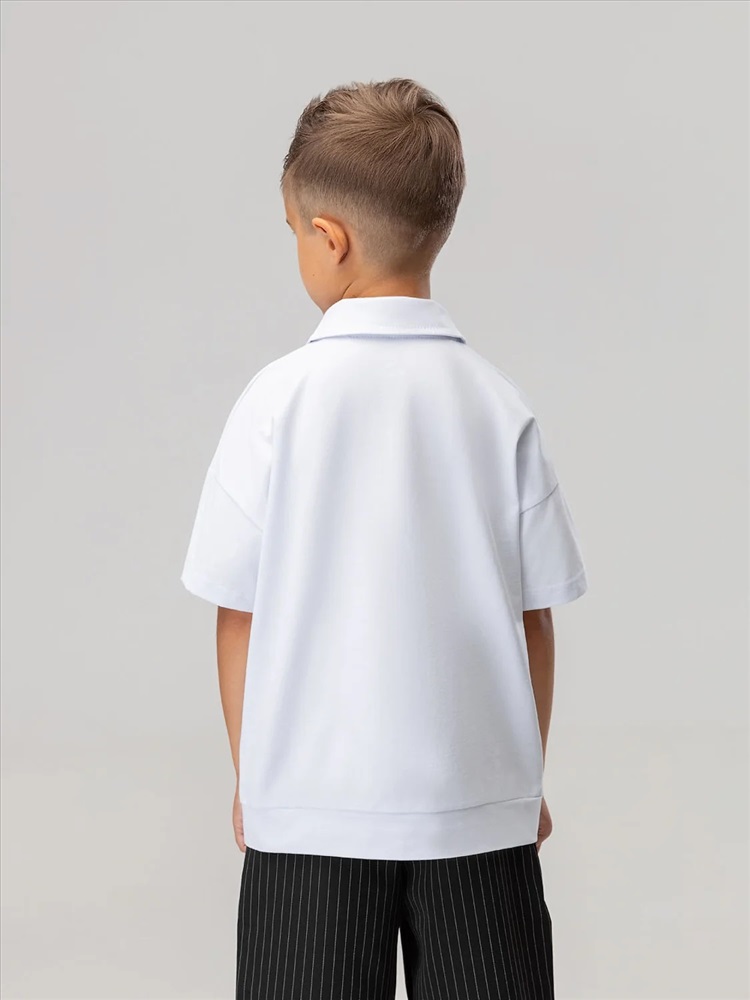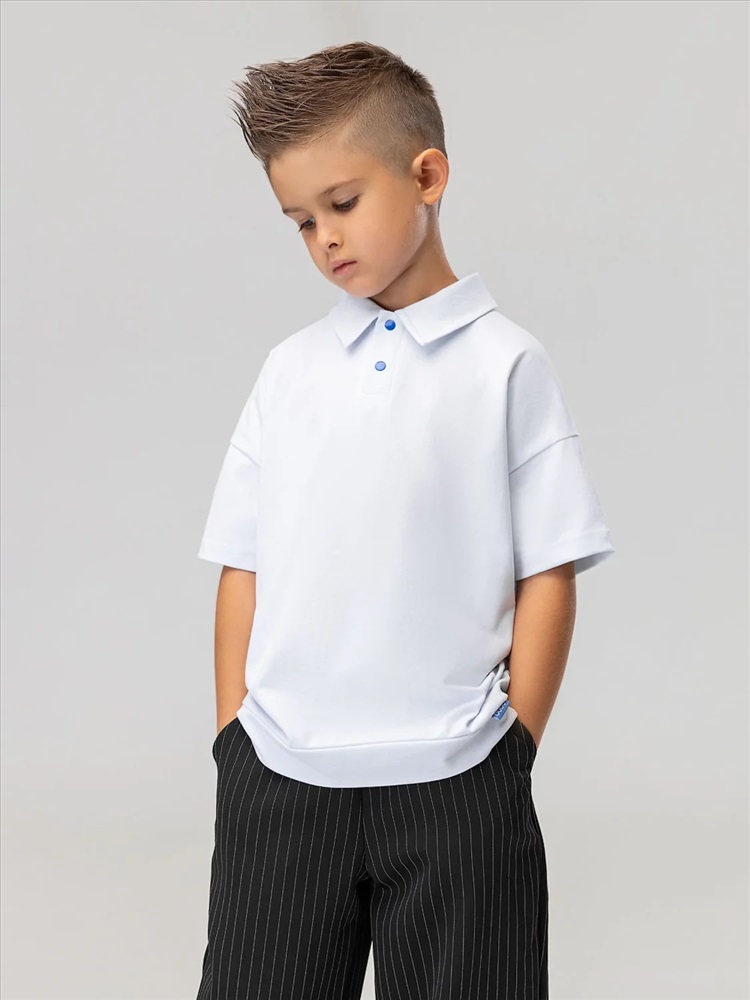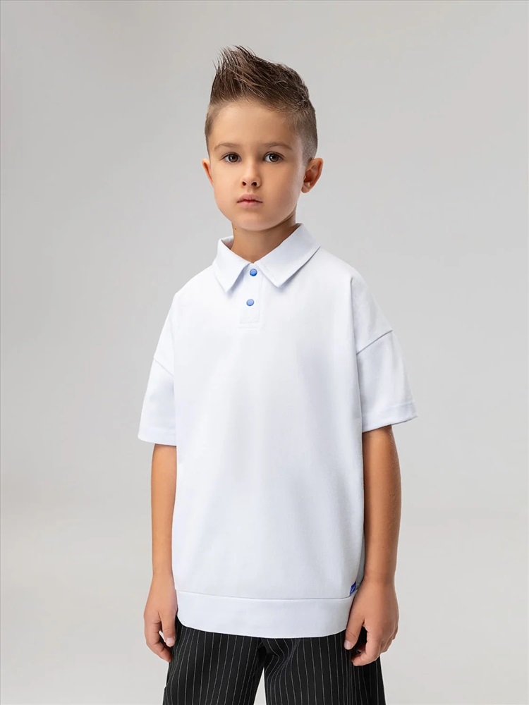 Футболка поло свободного силуэта, с коротким рукавом. Футболка с отложным воротником и застежкой на кнопки. Низ изделия прямой.