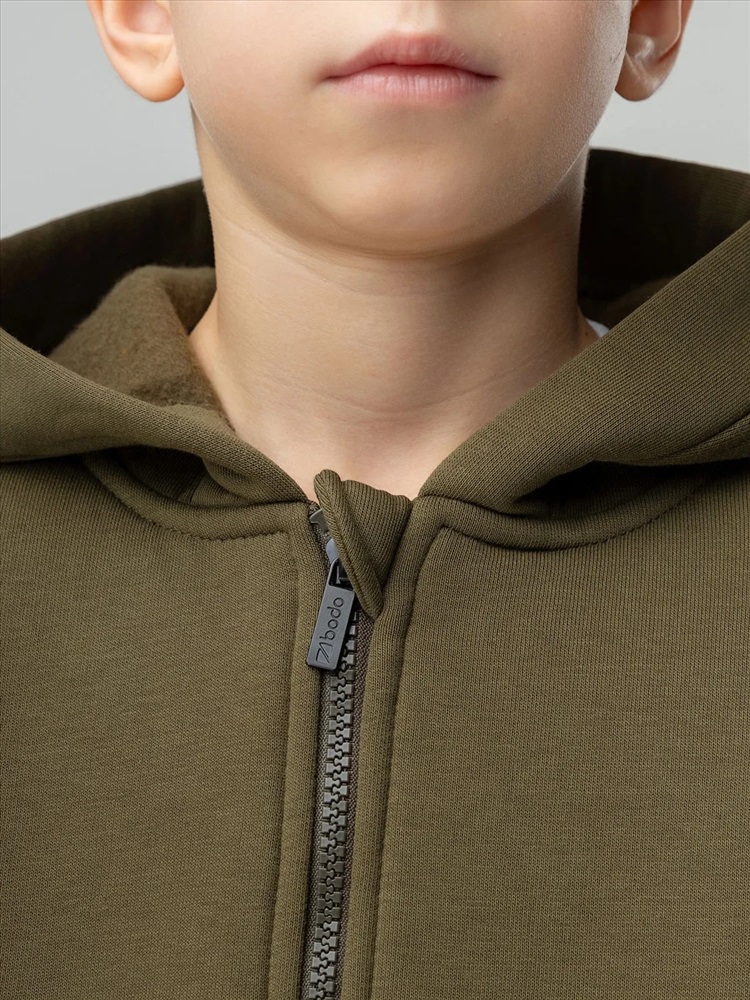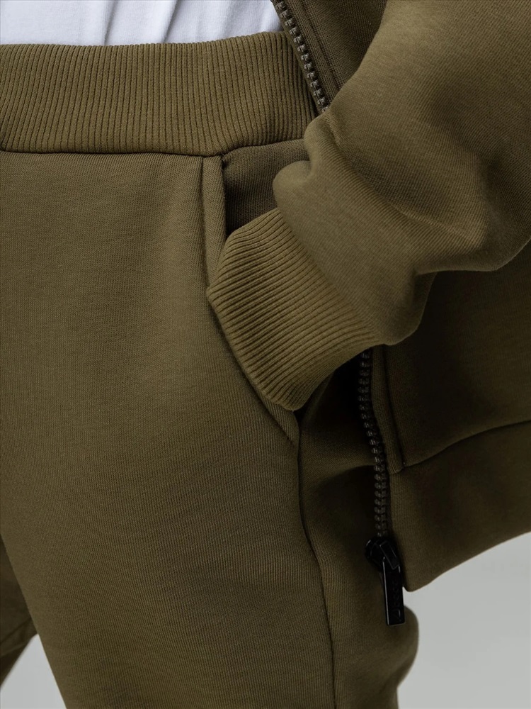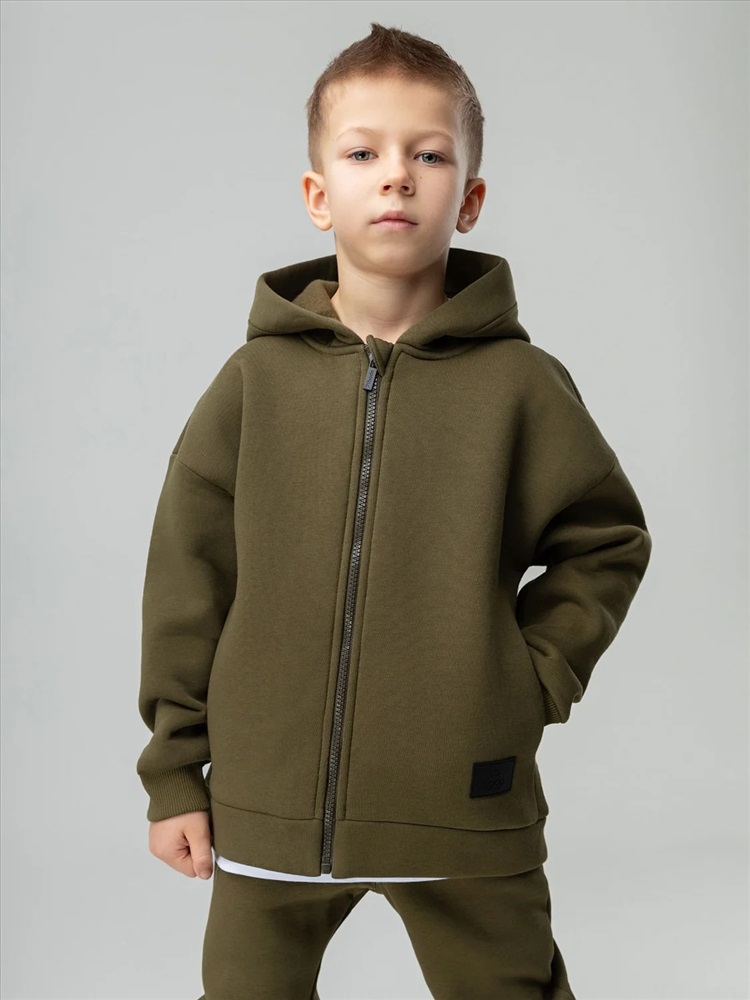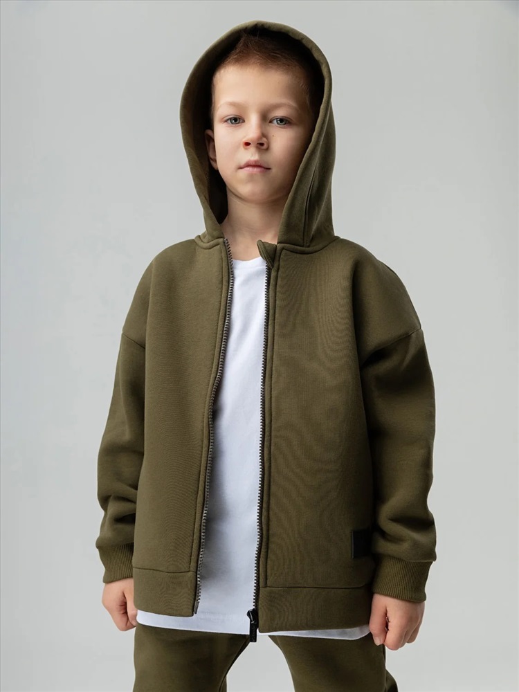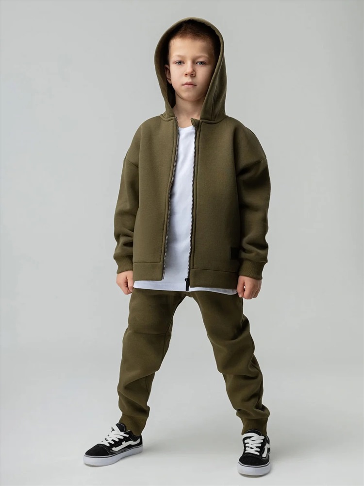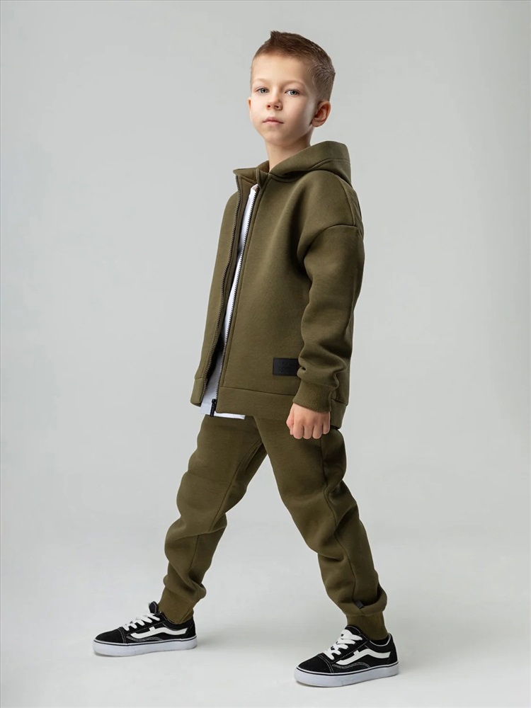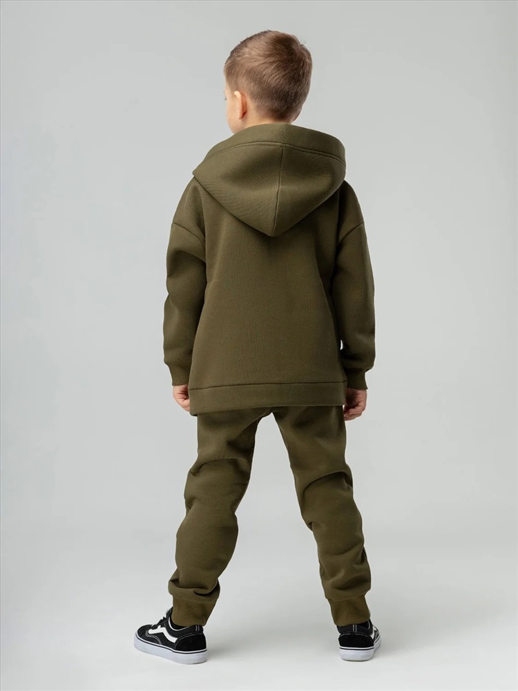 Костюм детский. Толстовка: свободный покрой, застежка - молния, рукава на манжетах, защитная планка на молнии, несъемный капюшон, прорезные карманы. Брюки- джоггеры, детали: пояс - эластичная резинка, низ изделия - манжеты, карманы с отрезным бочком. Состав: футер трехнитка с начесом 80% хлопок 20% полиэстер