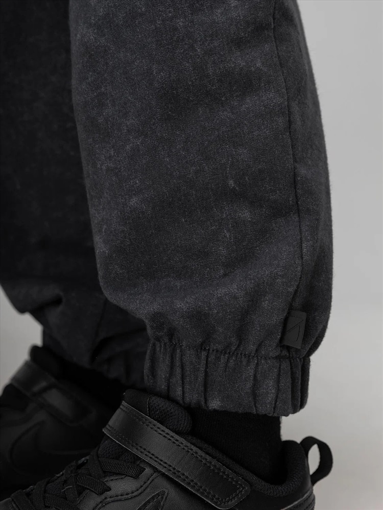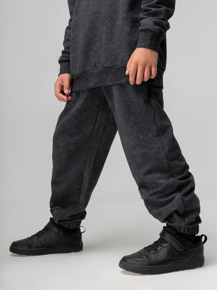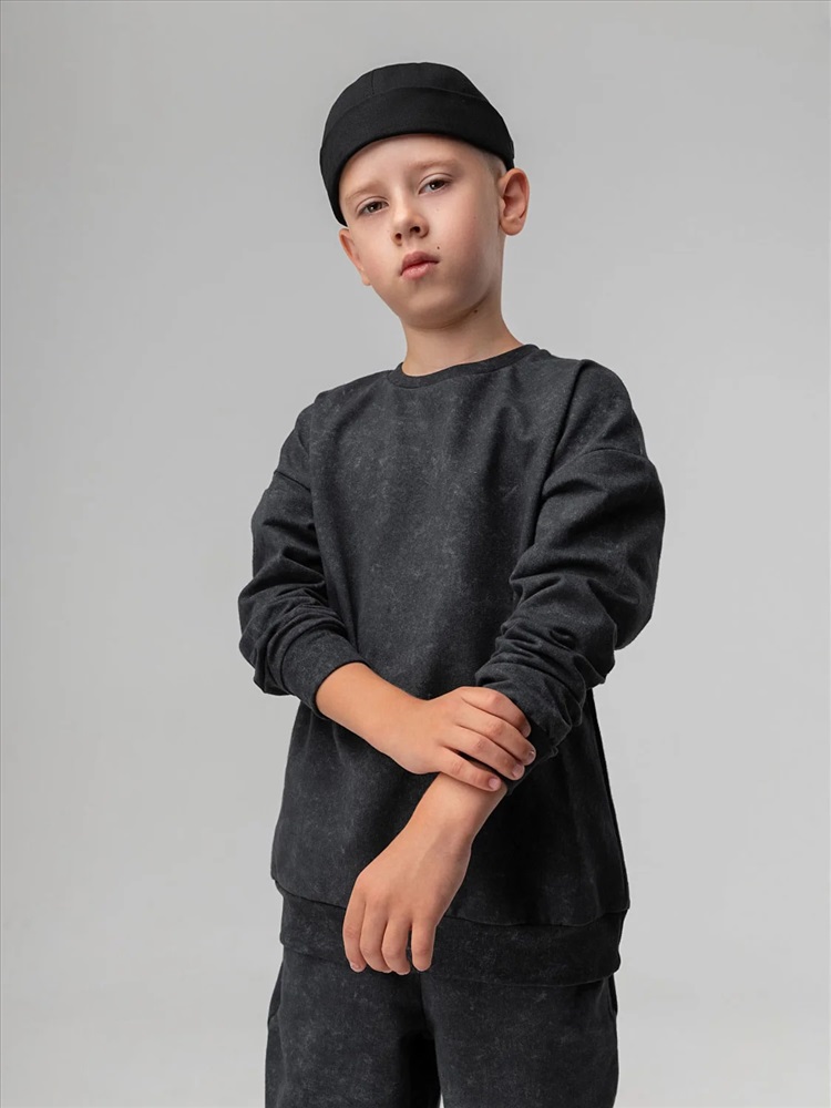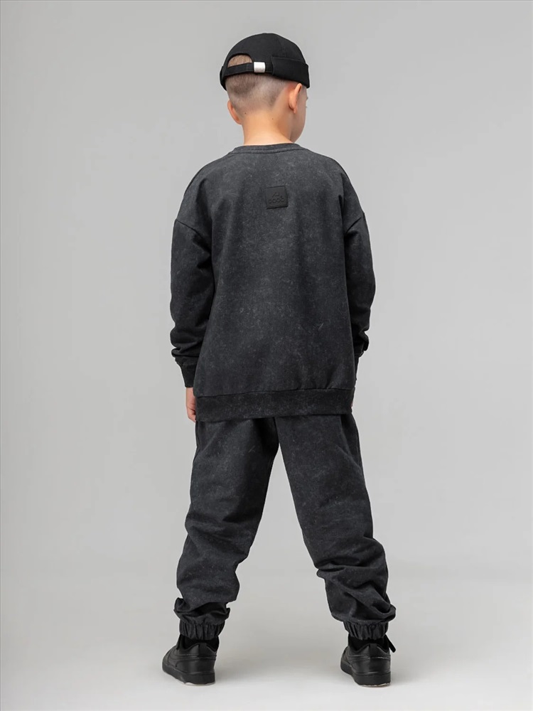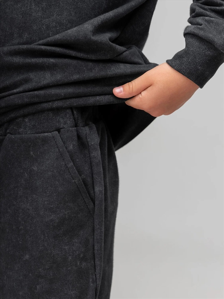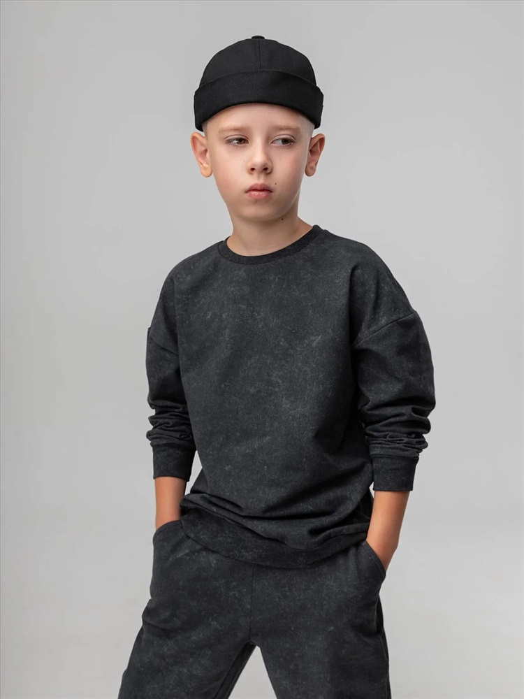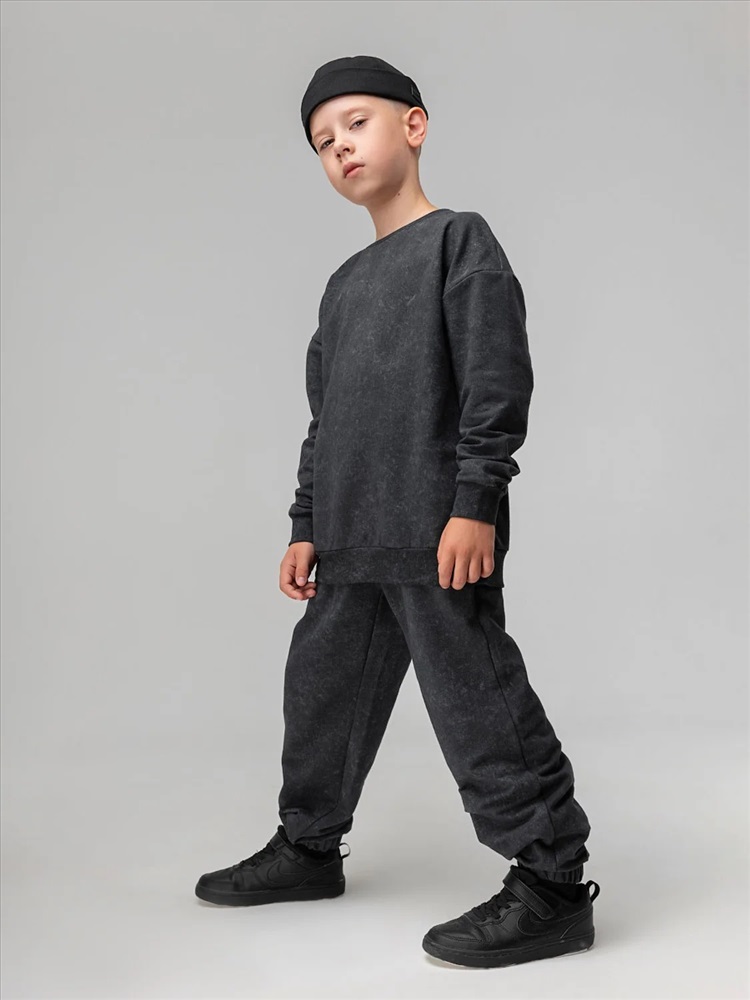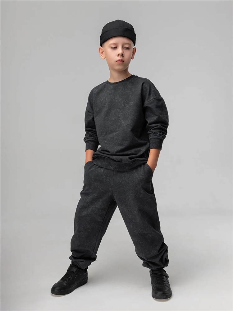 Костюм для детей дошкольного возраста. Толстовка без подкладки, прямого силуэта, с притачным поясом по низу изделия, со спущенным плечом и втачными рукавами с притачной манжетой. Горловина округлой формы, оформлена узким воротничком из рибаны.Брюки прямые свободные на притачном поясе с внутренней резинкой. Низ брюк с цельнокроеной манжетой на резинке. Брюки с боковыми карманами.