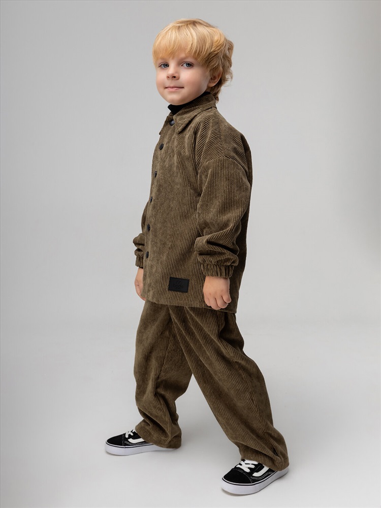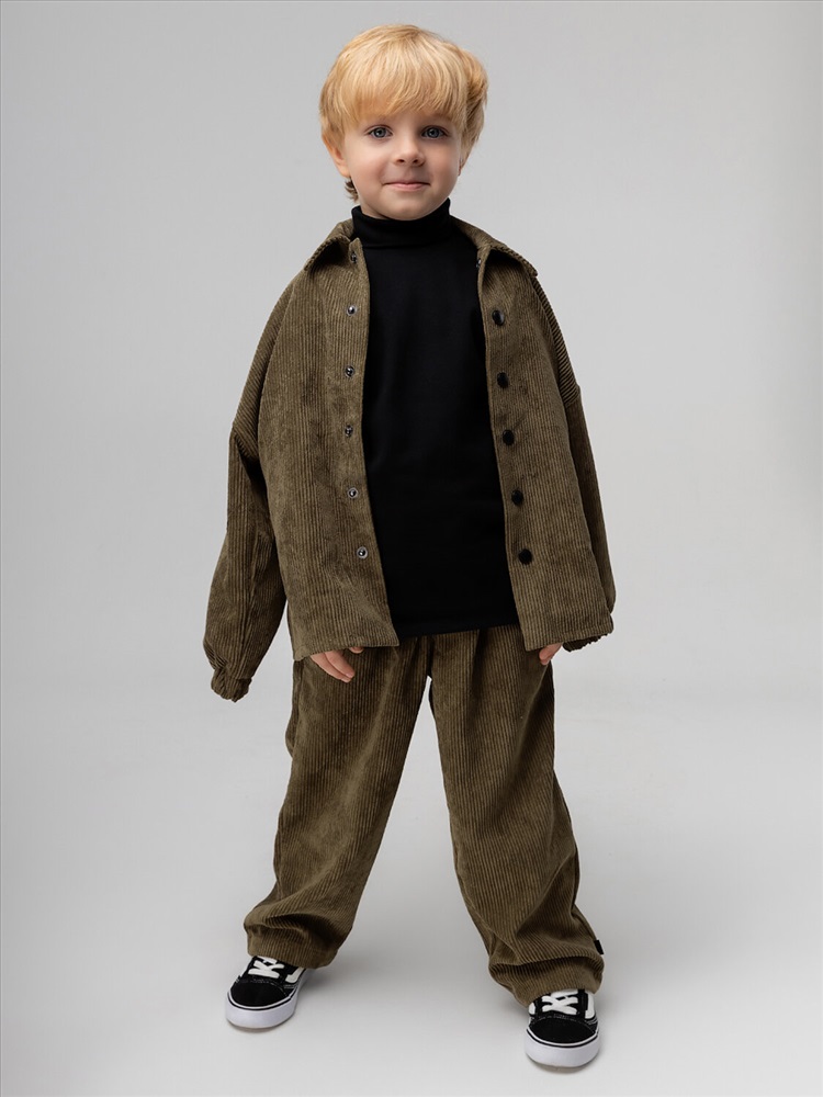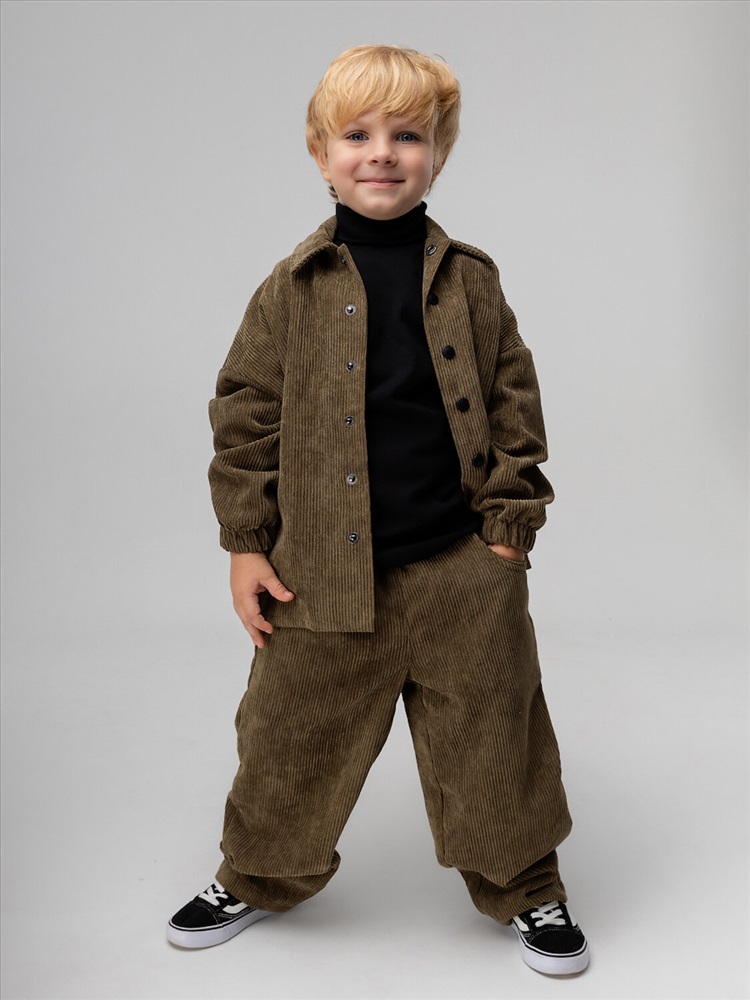 Костюм для детей дошкольного возраста. Рубашка без подкладки, прямого силуэта, с центральной бортовой застёжкой на кнопки, с отложным воротником, с втачными рукавами на резинке. Низ изделия ровный. Брюки свободного силуэта, расширенные в бёдрах и заужены к низу, на притачном поясе с внутренней резинкой, брюки с боковыми карманами. Низ изделия прямой.