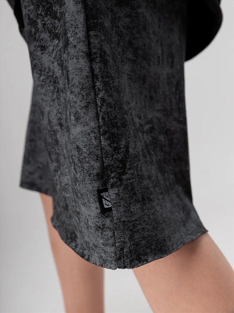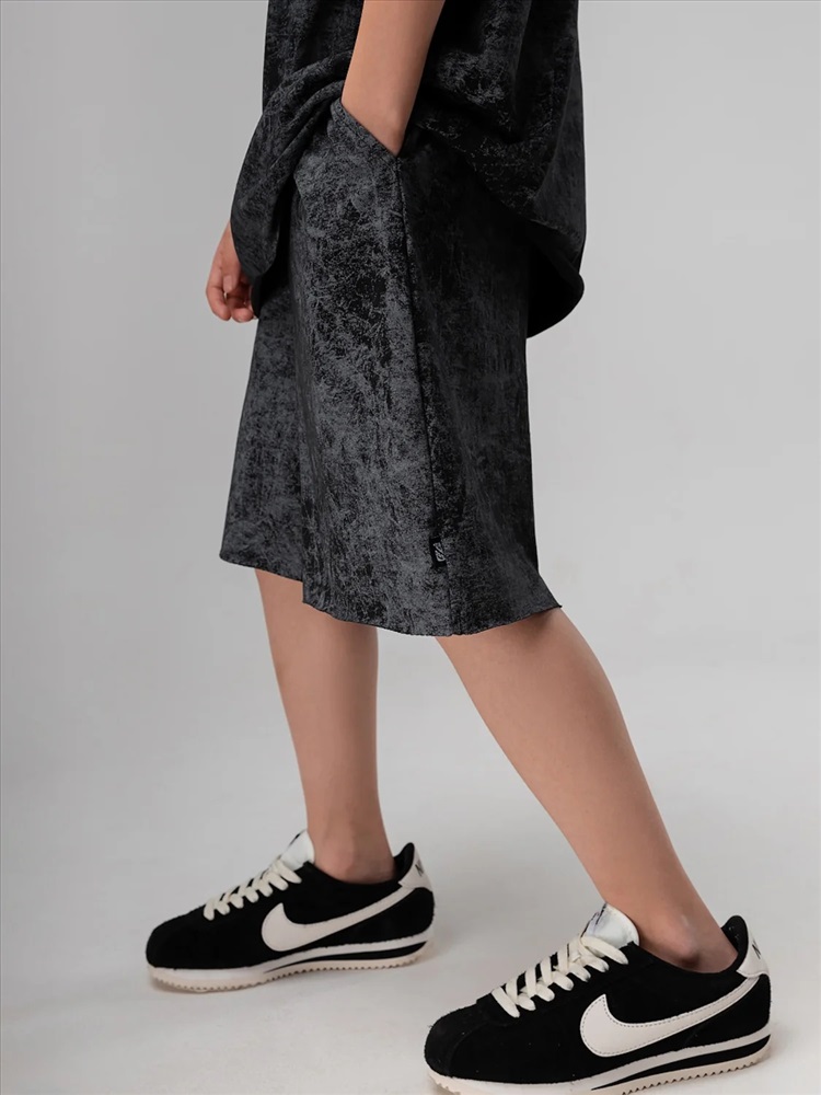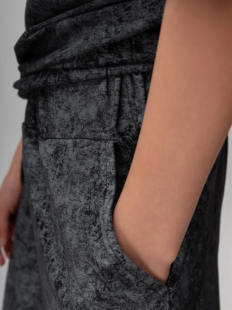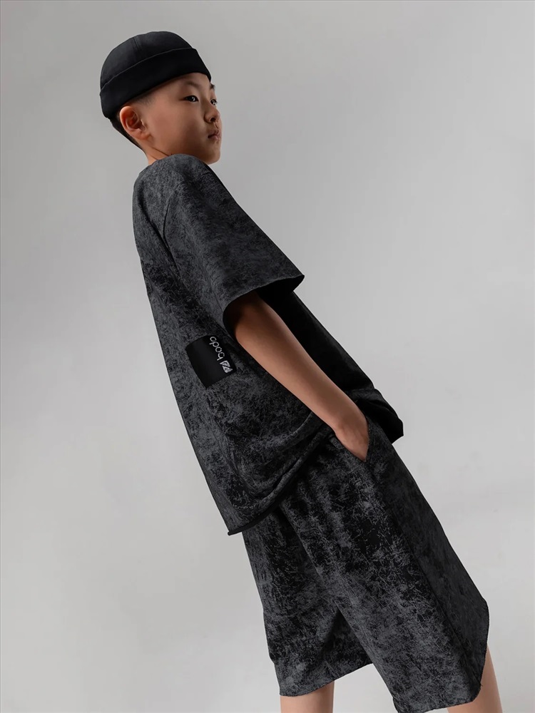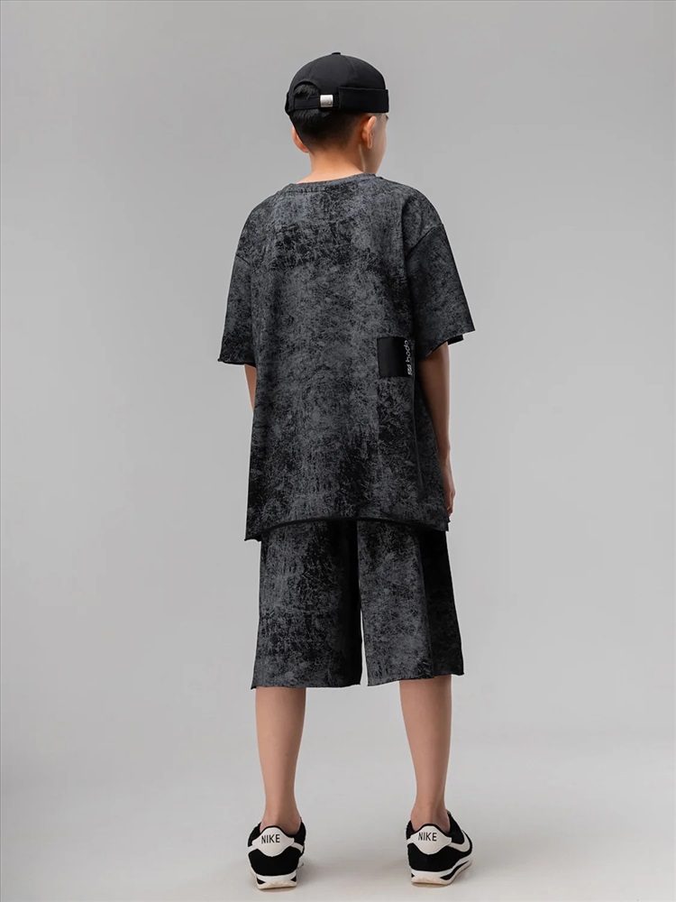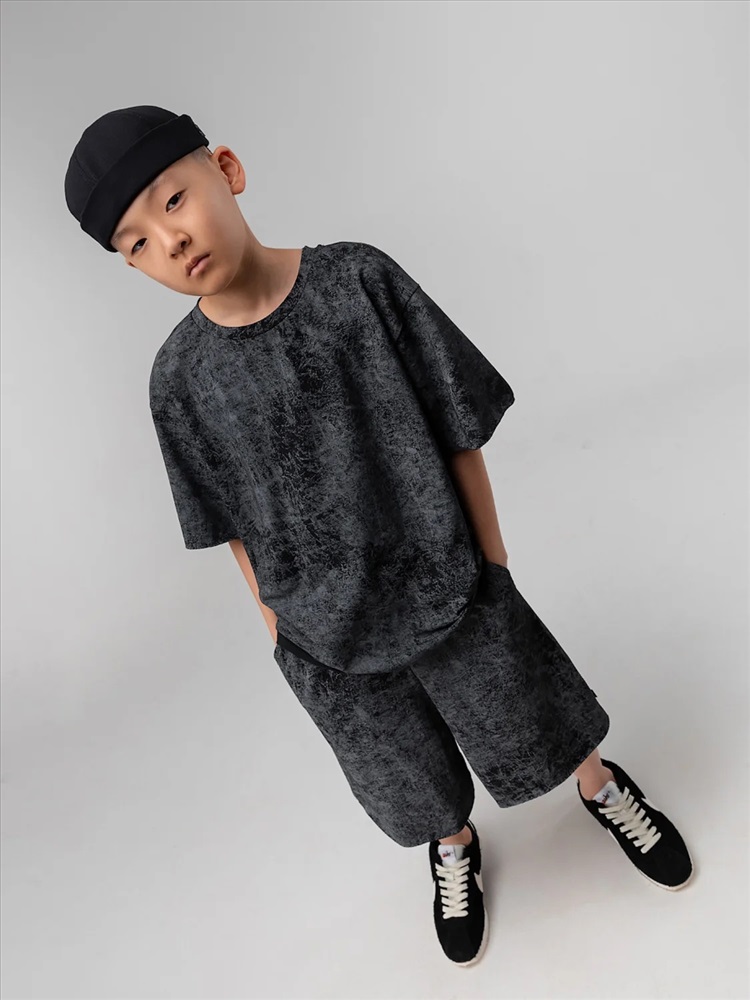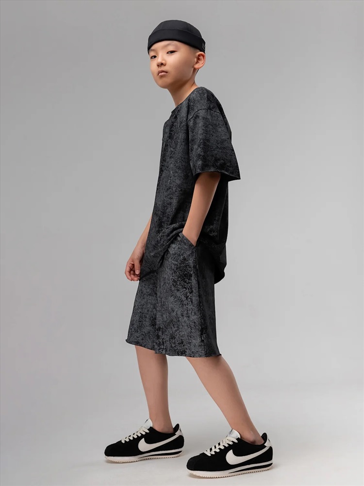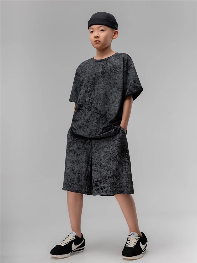 Костюм для детей школьного возраста. Футболка свободного силуэта с втачным коротким рукавом. Горловина футболки округлой формы. Низ изделия и низ рукава не обработаны. Шорты прямые, свободные на притачном поясе с внутренней резинкой, с боковыми карманами отрезной бочок. Шорты по низу изделия с необработанным краем.