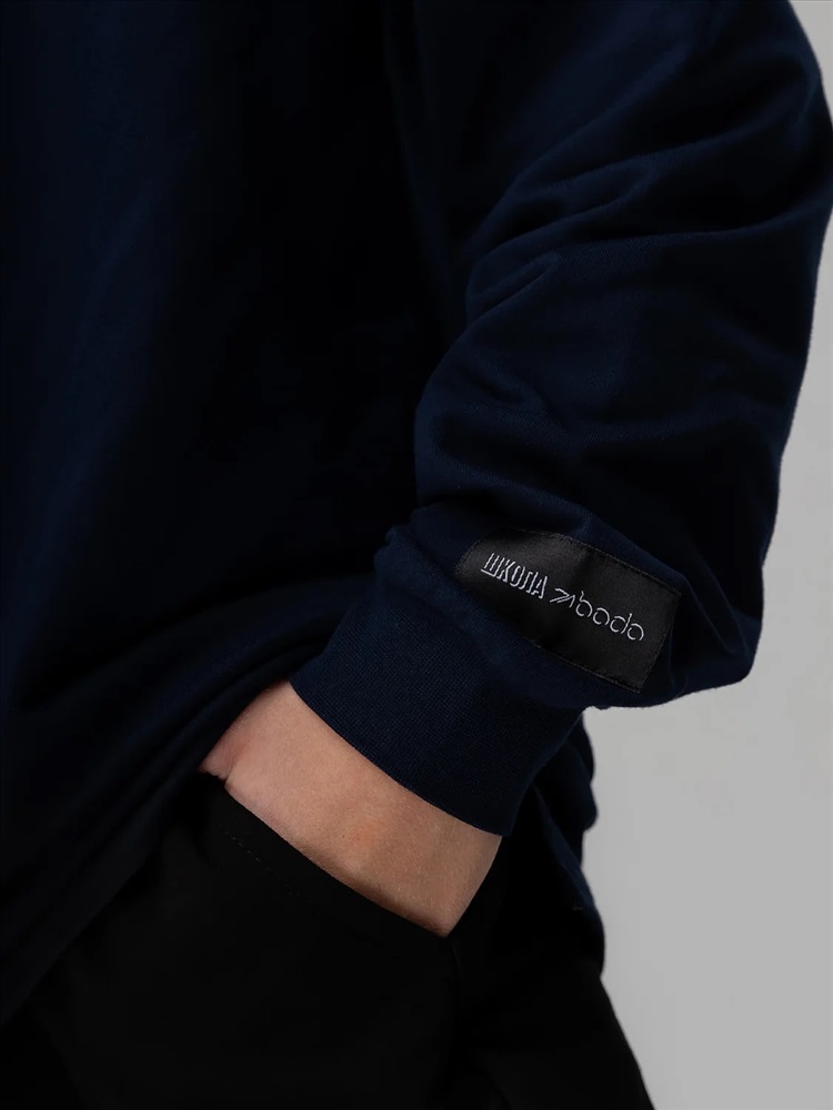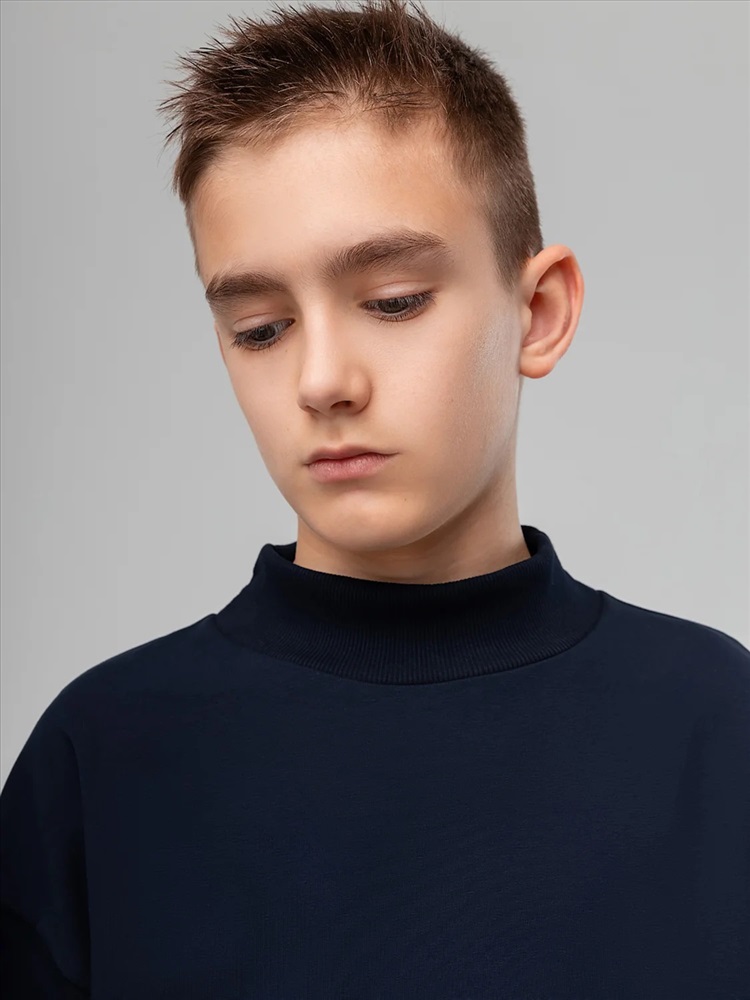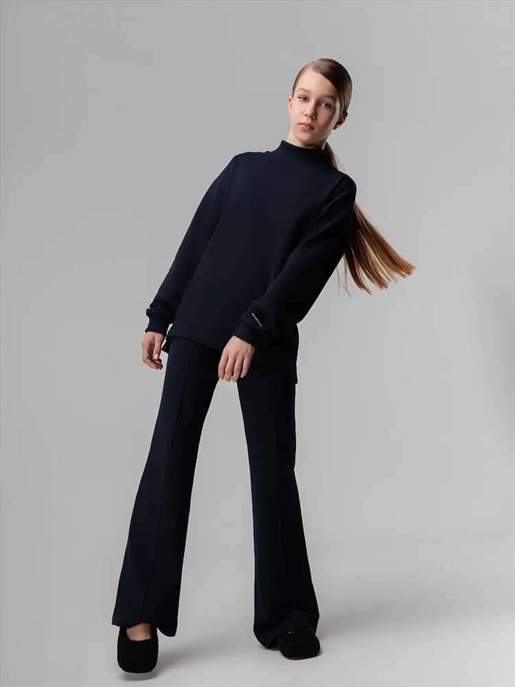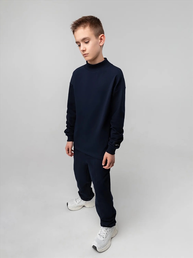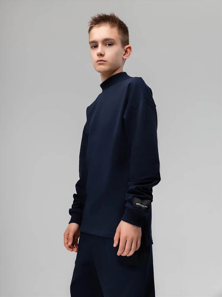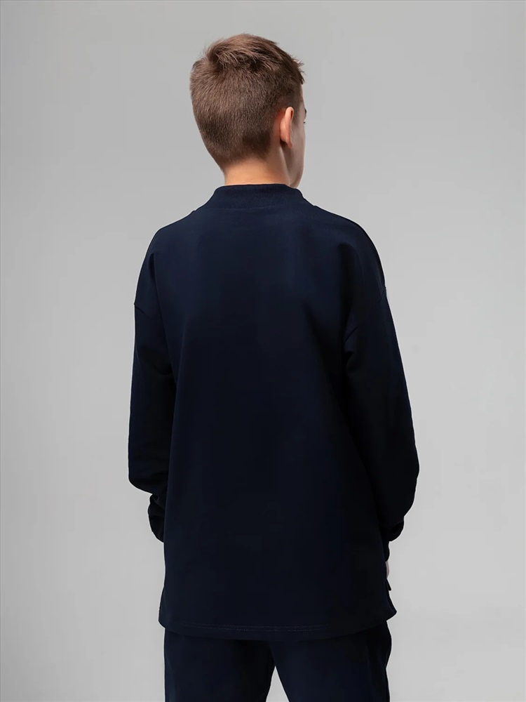Свитшот с удлиненной спинкой и разрезами по бокам. Длинный рукав на манжетах, воротник стойка.