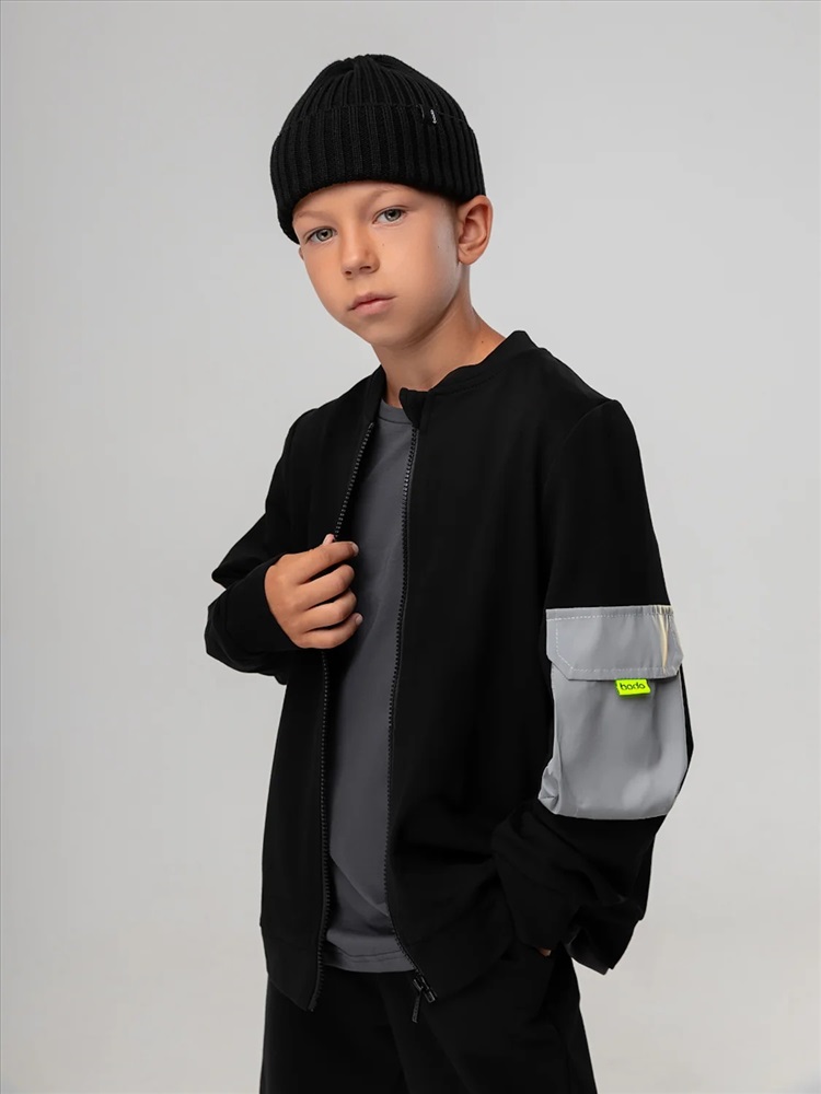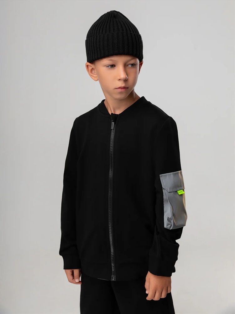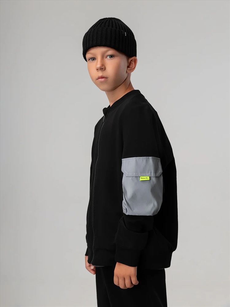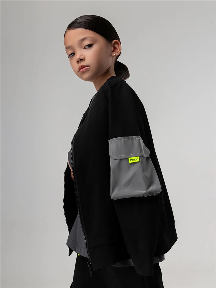 Свободный бомбер с центральной застёжкой на молнию. Бомбер со спущенным плечом и длинным рукавом с манжетой. На левом рукаве расположен светоотражающий карман.