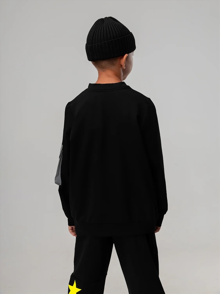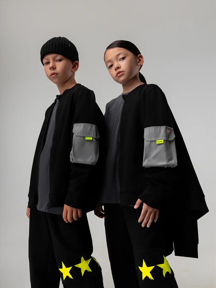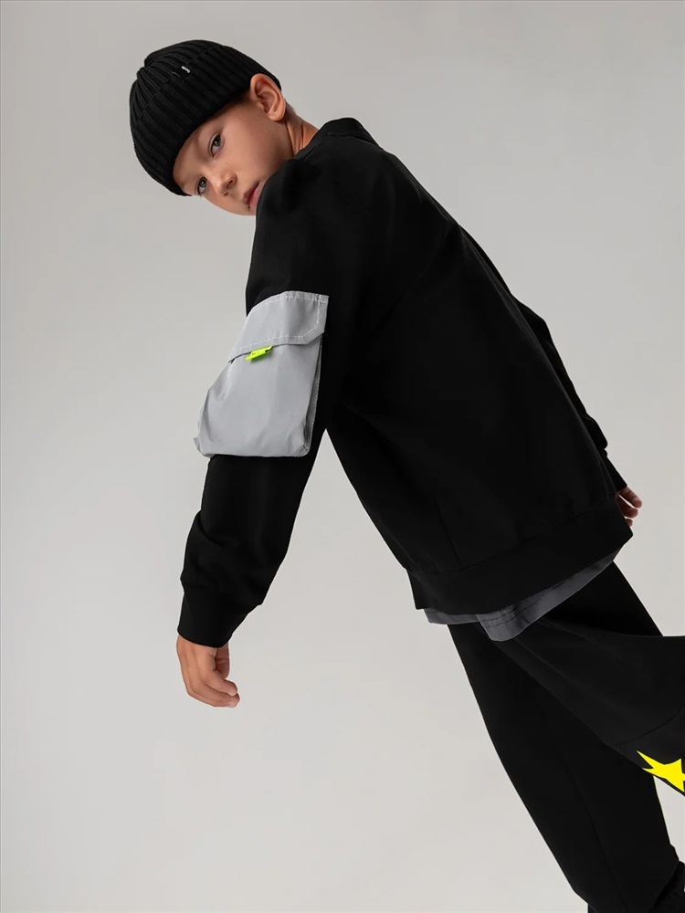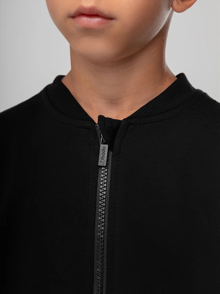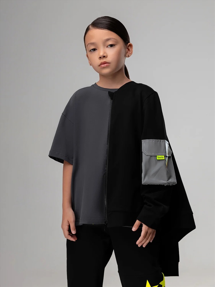 Свободный бомбер с центральной застёжкой на молнию. Бомбер со спущенным плечом и длинным рукавом с манжетой. На левом рукаве расположен светоотражающий карман.